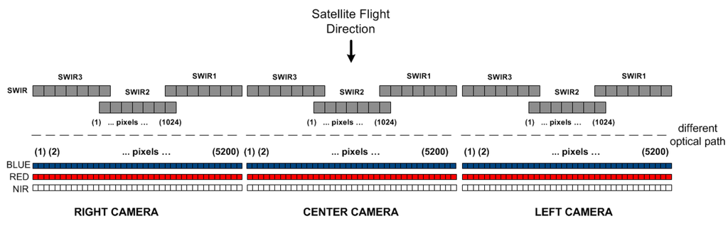 The PROBA-V is composed of three separate cameras (identical Three-Mirror Anastigmatic (TMA) Telescopes) in order to cover a wide field-of-view. Each TMA has two focal planes: one for the VNIR and one for the SWIR. The VNIR detector is a Quadrilinear detector with only three out of the four lines used for imaging of the blue, the red and the NIR band, respectively. The SWIR detector consists of three linear detectors or strips of 1024 pixels, referred to as SWIR1, SWIR2 and SWIR3, which are mechanically butted to one large detector. This instrument layout is schematically represented in Figure 1. There is an overlap of about 75 VNIR pixels between the LEFT and the CENTER camera and between the CENTER and RIGHT cameras, respectively.