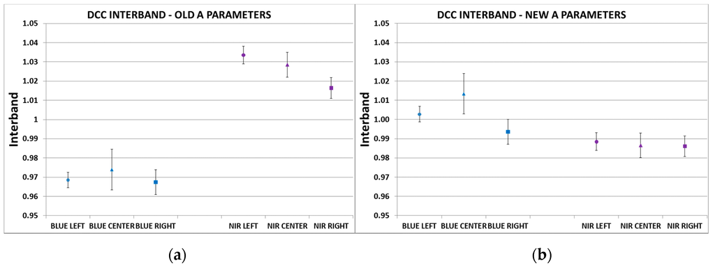 Inter-band Deep Convective Cloud (DCC) results, relative to the RED reference band: (a) with pre-flight calibration coefficients; (b) with the vicariously updated calibration coefficients (.