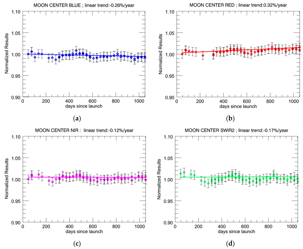 In Figure 4, the PROBA-V lunar calibration results normalized to the first observation are given for the BLUE, RED, NIR and SWIR2 strips of the center camera. A linear regression is fitted to the data to quantify degradation over time: