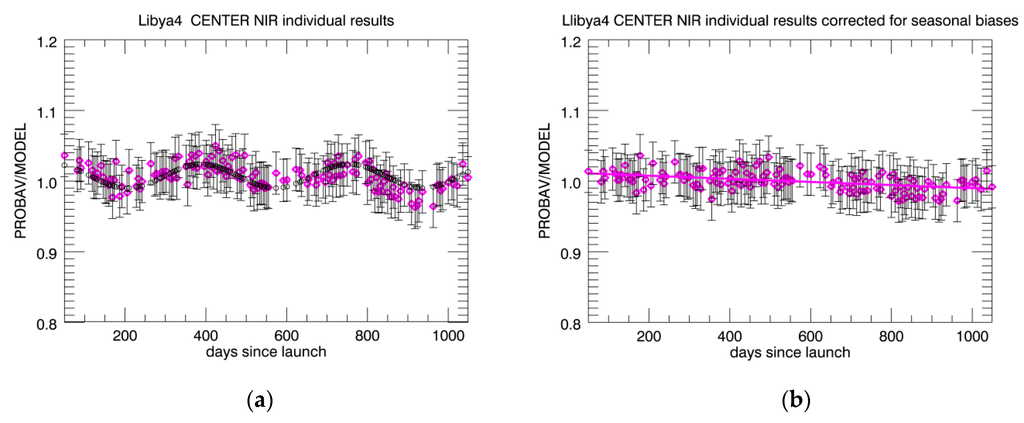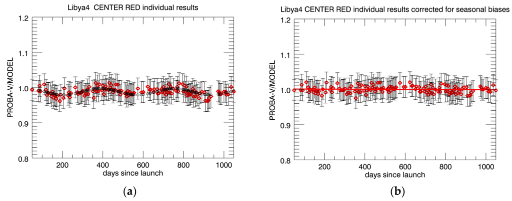 OSCAR Libya-4 PROBA-V results: (a) red diamonds: individual CENTER RED strip results (obtained using a constant absolute calibration parameter) depicted with 3% error bars; Black circles: fitted cosine function; (b) OSCAR Libya-4 results corrected for seasonal trend and fitted linear model.
