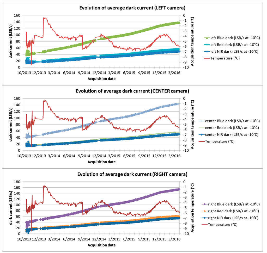 For the VNIR sensors, dark current values for all pixels are negligible, considering also the low integration times used during nominal operations (maximum 6 ms). In Figure 7, the average dark current evolution for each VNIR band is shown, from the start of the operational phase up to 19 April 2016. The dark current values are rescaled to the reference temperature of −10 °C, according to the pre-launch dark current temperature relationship. The increase in dark current shows a consistent linear relationship for each band, excluding small variations at the start of the operational phase, between October and November 2013. Linear regression functions for each band are provided in Table 4, together with a predicted dark current value at the end of the operational lifetime (end-of-life, or EOL). Even at EOL, the dark current for all VNIR bands is barely noticeable. Comparing cameras for the same bands, the same dark current levels are found and this applies for all bands. Differences are found in the dark current of different bands. This is explained by the different gain settings in the Analog-to-Digital Converter, which scales the analog dark current to a different digital level. The difference in dark current is explained fully by this difference in scale (5.8 V/V for Blue compared to 2.29 V/V for Red and 1.99 V/V for NIR).