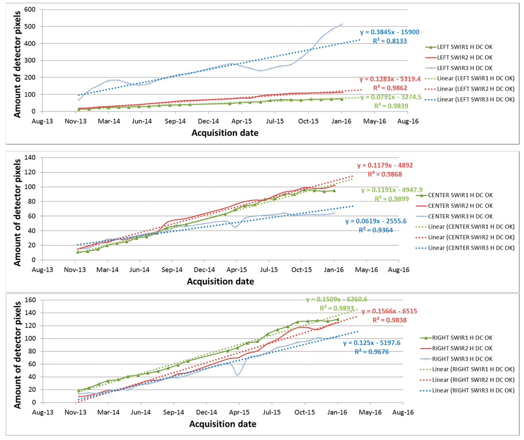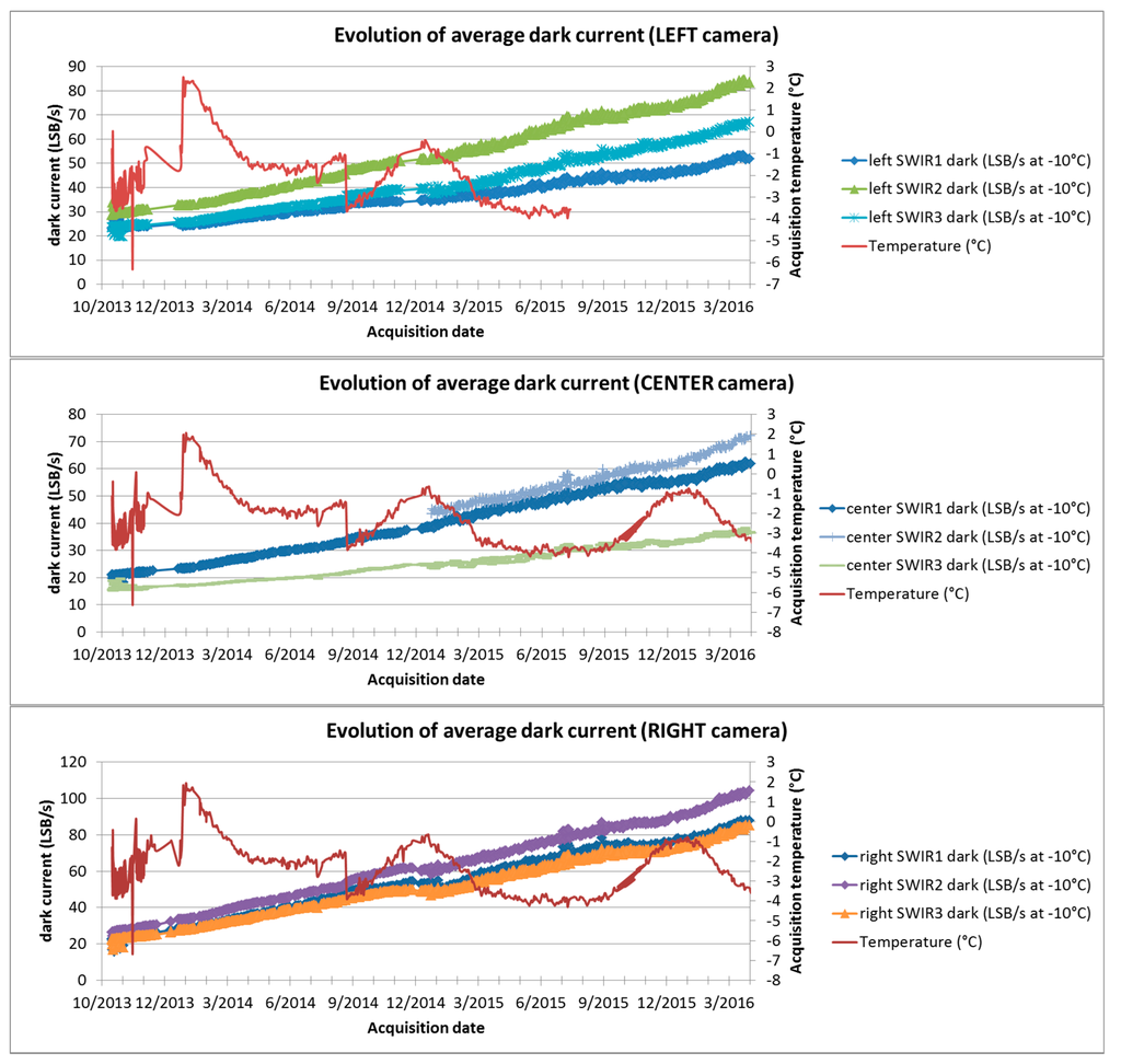 For the SWIR sensors, the average dark current level is also quite low but slightly higher than for the VNIR sensors, considering the higher integration times used in nominal operations (maximum 24 ms). Figure 8 shows the average dark current evolution for each SWIR band, from the start of the operational phase up to 19 April 2016, and with values rescaled to the reference temperature of −10 °C. A slight drop of about 2LSB/s in the linear trend is noticed after 16 January 2015, which coincides with the decision to adopt a lower integration time for SWIR dark calibration acquisitions (0.2048 s instead of 2.9696 s). As this effect is minor, results for linear regression are provided for the full evaluation period (Table 5). The predicted EOL average dark current levels are still sufficiently low as to not impede the operational mission. Differences are observed between cameras (the right camera sensors show a higher rate of increasing dark current) and between individual sensors (all SWIR2 or ‘middle’ sensors show a higher dark current than their counterparts SWIR1 and SWIR3).