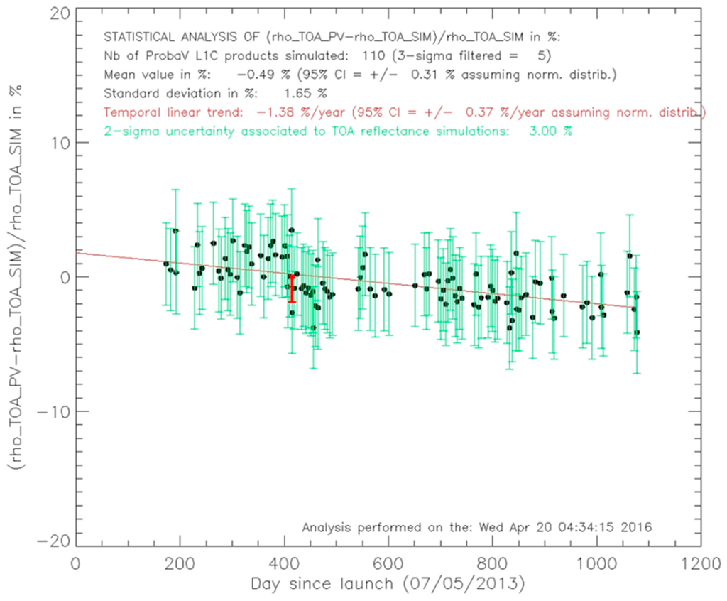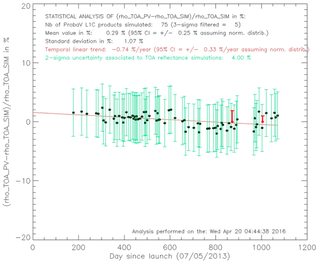 Time series of relative difference in % between the PROBA-V TOA reflectance in the BLUE band of the CENTER TMA and the simulated PROBA-V reflectance using a hyperspectral TOA model with BRDF surface parameters inverted from four years of MERIS TOA data. The statistical analysis of the time series provides the mean relative difference, the standard deviation and the temporal trend obtained from a linear fitting of the time series. A 95% confidence interval on the mean relative difference and the temporal trend is obtained assuming a normal distribution of the mean relative difference. The green error bar represent the uncertainty associated to each simulation of the PROBA-V TOA reflectance. The red bar located around day 400 since launch indicates the change (decrease) in radiometric calibration applied to the PROBA-V L1C processing.