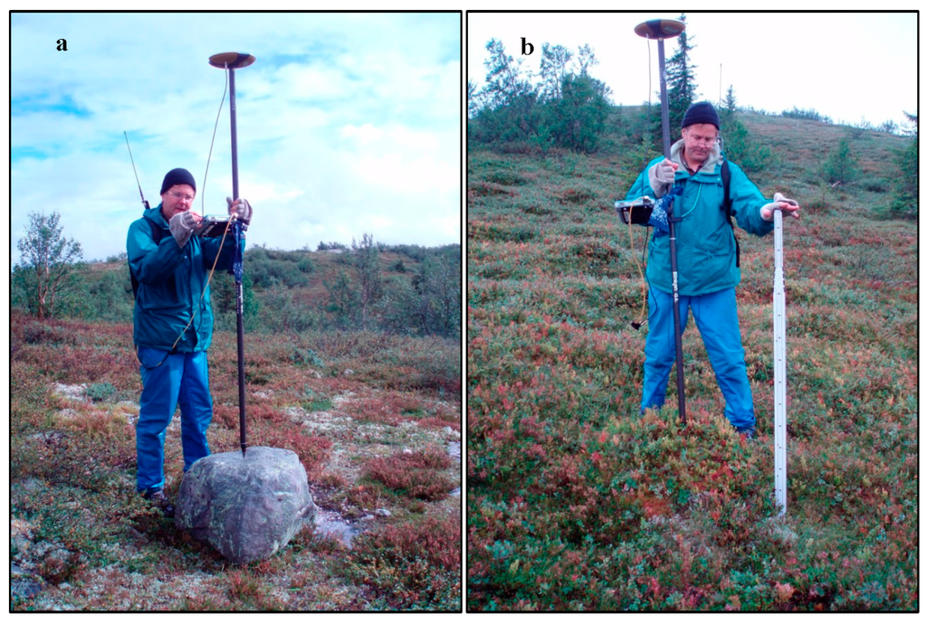 Field measurements. Examples of two non-tree objects: (a) Rock; and (b) “Organic” (tussocks, hummocks, and rocks covered with moss and other vegetation). Photographs taken 29 August 2006.