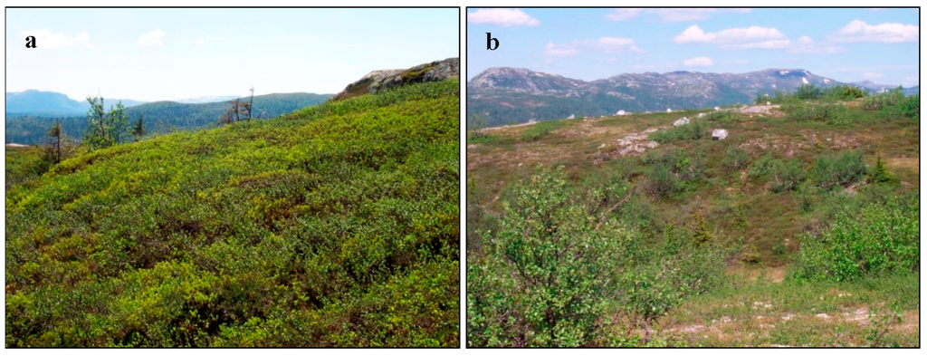In Korpela’s study [], it was shown that light lichens like the common Cladina (reindeer) lichen had a higher reflectivity than the contrasting ground vegetation using an ALS system with a wavelength of 1064 nm. The contrasting vegetation consisted of mosses and a shrub layer of heather (Calluna vulgaris), lingonberry (Vaccinium vitis-idaea), and crowberry (Empetrum nigrum). These are also among the most common species in the boreal-alpine ecotone in Scandinavia. The fact that these species might have a slightly lower reflectivity at 1064 nm than light lichens and probably a reflectivity not very different from small trees (<1 m), especially deciduous trees like birch, may indicate that discriminating between small trees and non-trees might be more difficult for certain types of ground vegetation.