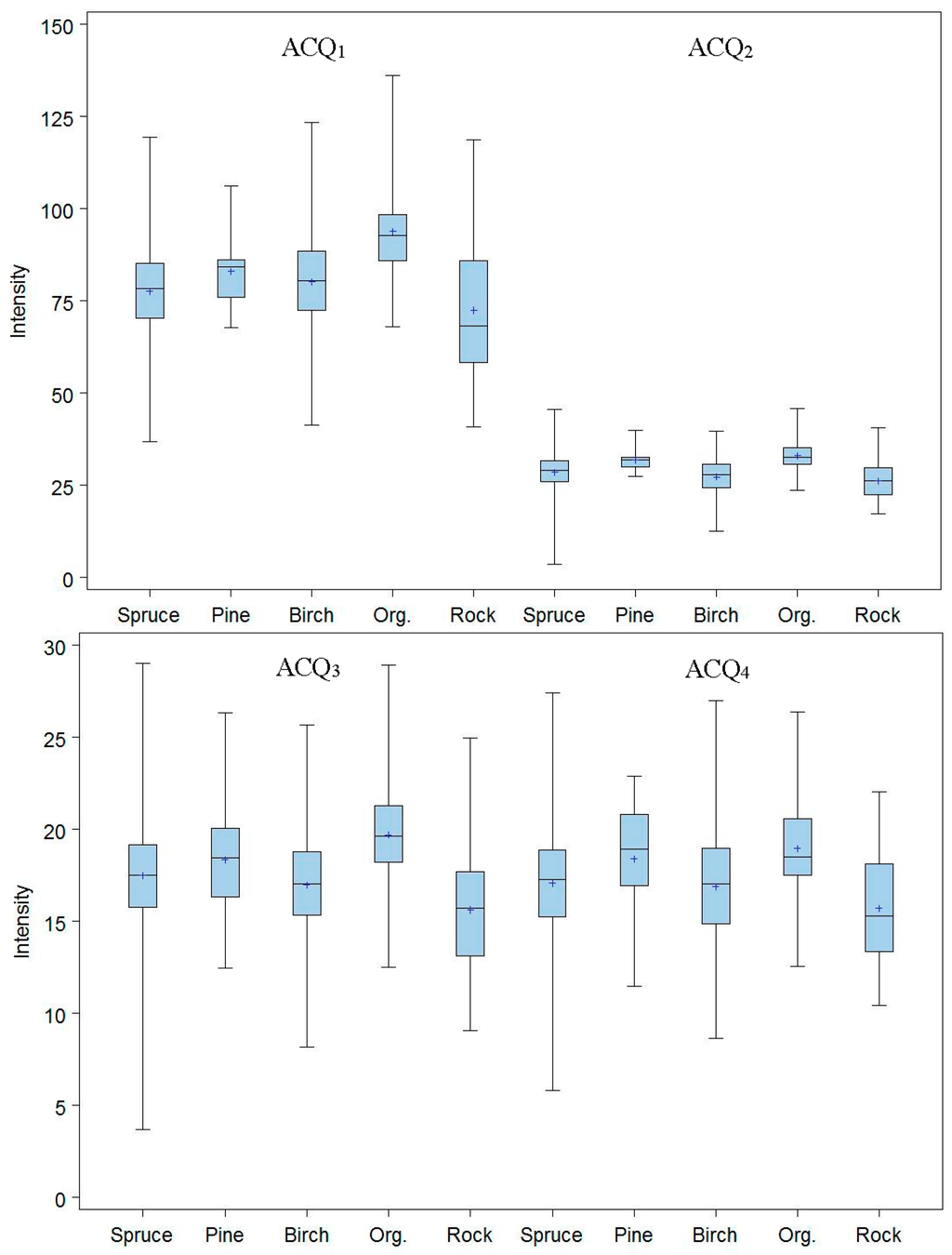 Large differences in intensities between the different ALS acquisitions were revealed (Figure 6). The mean values of the tree-level intensities for spruce trees ranged from 18.1 for ACQ4 to 79.6 for ACQ1 (Table 4). Correspondingly, the mean intensities for pine and birch were in the ranges 18.0–84.7 and 17.7–82.8. For non-tree objects with organic surface the mean intensities ranged from 18.9 to 91.7. For rocks the range was 16.4–75.3. The differences between acquisitions in intensity values of the single echo with the largest height value within each object (hmax) followed more or less the same patterns as the mean intensity values (Table 4).