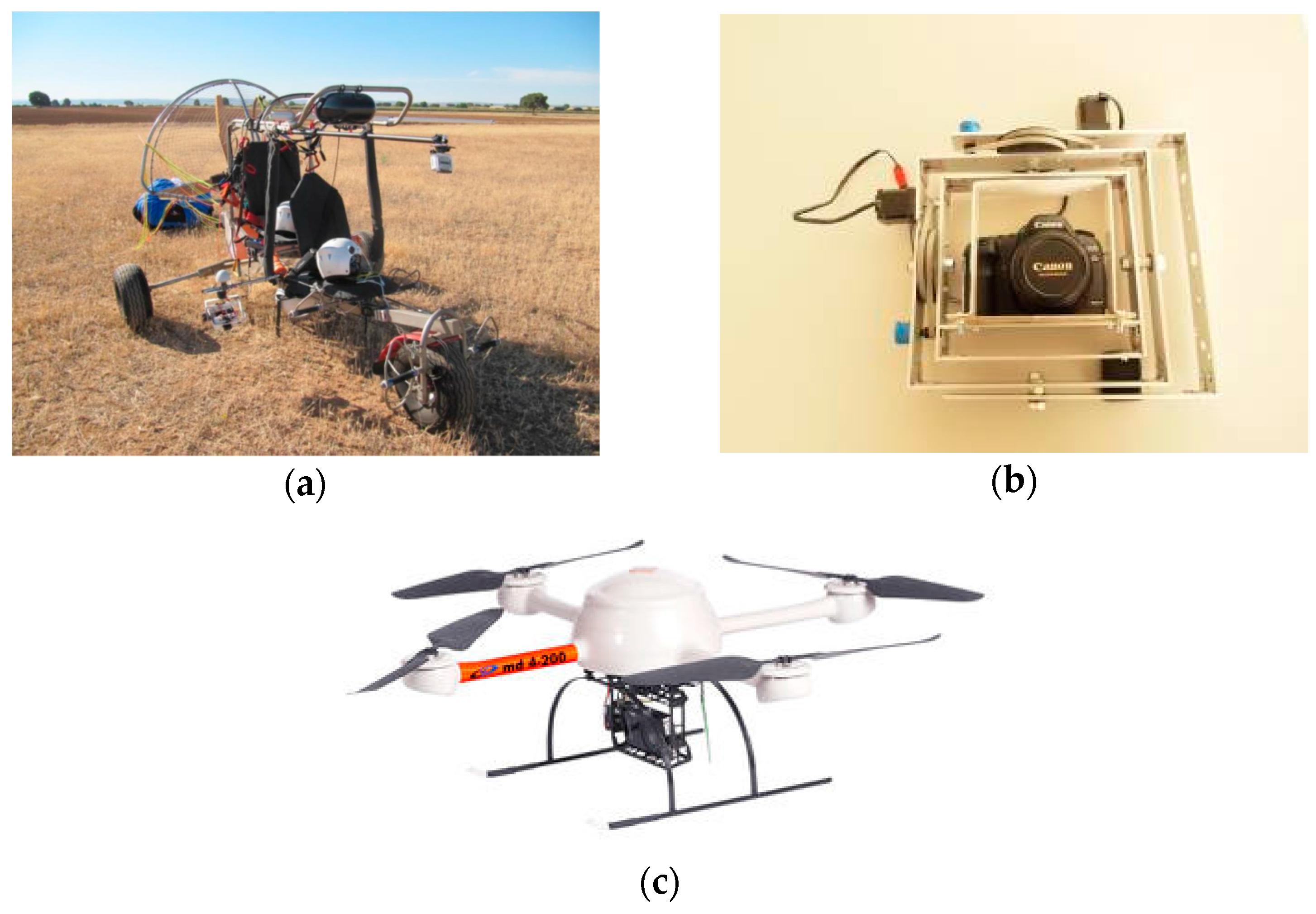 In order to fulfill the archaeological documentation requirements, the aerial data gathering was performed with a paratrike which allows us to enclose the whole extension of the archaeological site using a full-frame reflex camera, assisted by a specific gyrostabilized platform (MUSAS-MUltiSpectral Airborne Sensors) with a ground sample distance (GSD) of 3 cm. According to the GSD desired for the whole archaeological site and considering the camera specifications, a maximum flight height of 224 m was established. As a result, a total of 268 images along seven strips (NW-SE direction) were required for guaranteeing a side overlap of >30% and a forward overlap of >70%.