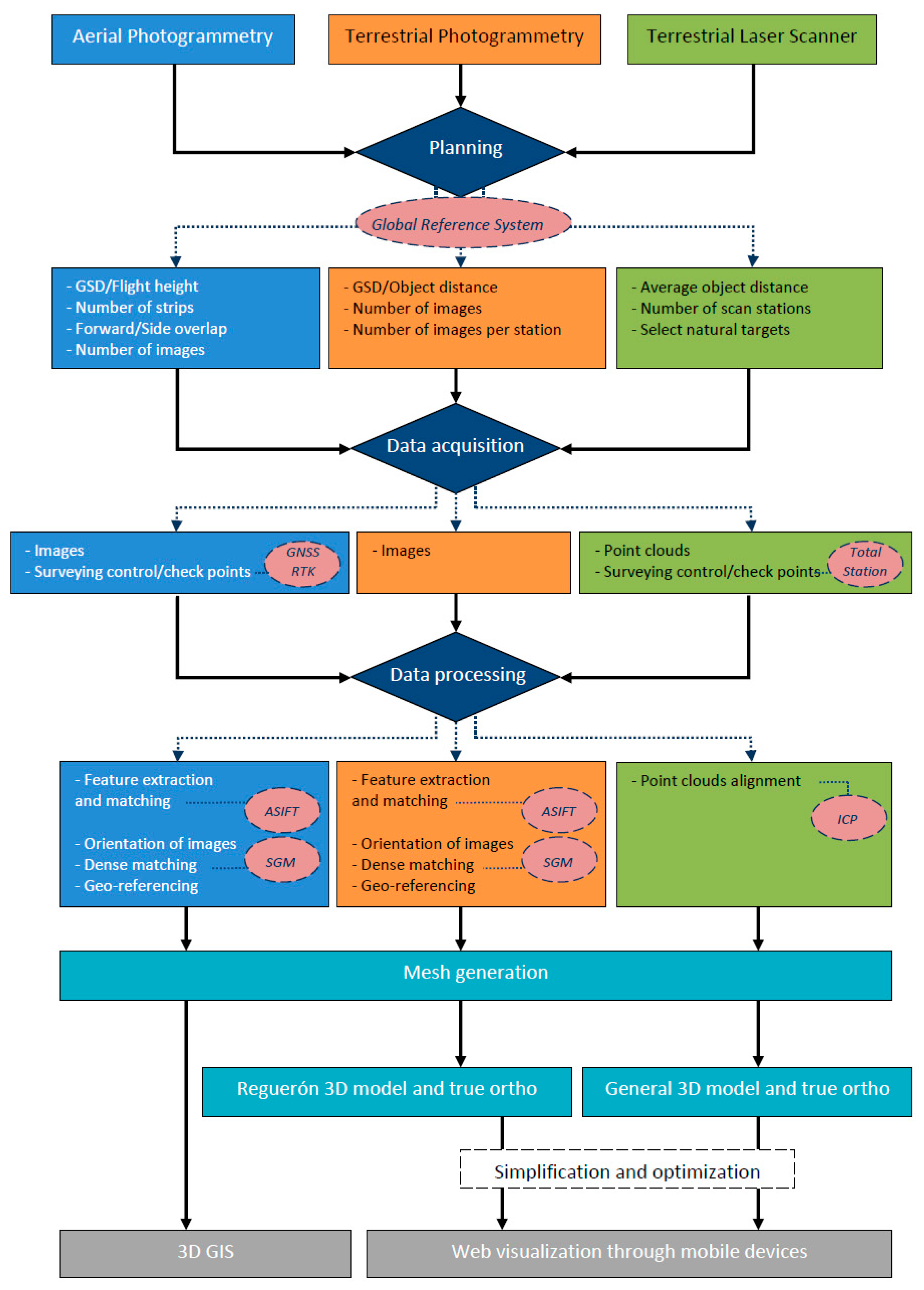 In addition, to increase the level of detail in the fortification walls and thus avoid the occlusions due to the effects of terrain relief (i.e., areas occluded or without information in the model generated by aerial photogrammetry), a combination of terrestrial photogrammetry and terrestrial laser scanner (TLS) was employed for improving the final 3D hybrid model. As a result, a total of 36 terrestrial oblique images and 13 TLS point clouds were acquired in order to avoid areas without information, guaranteeing a subcentimeter resolution.