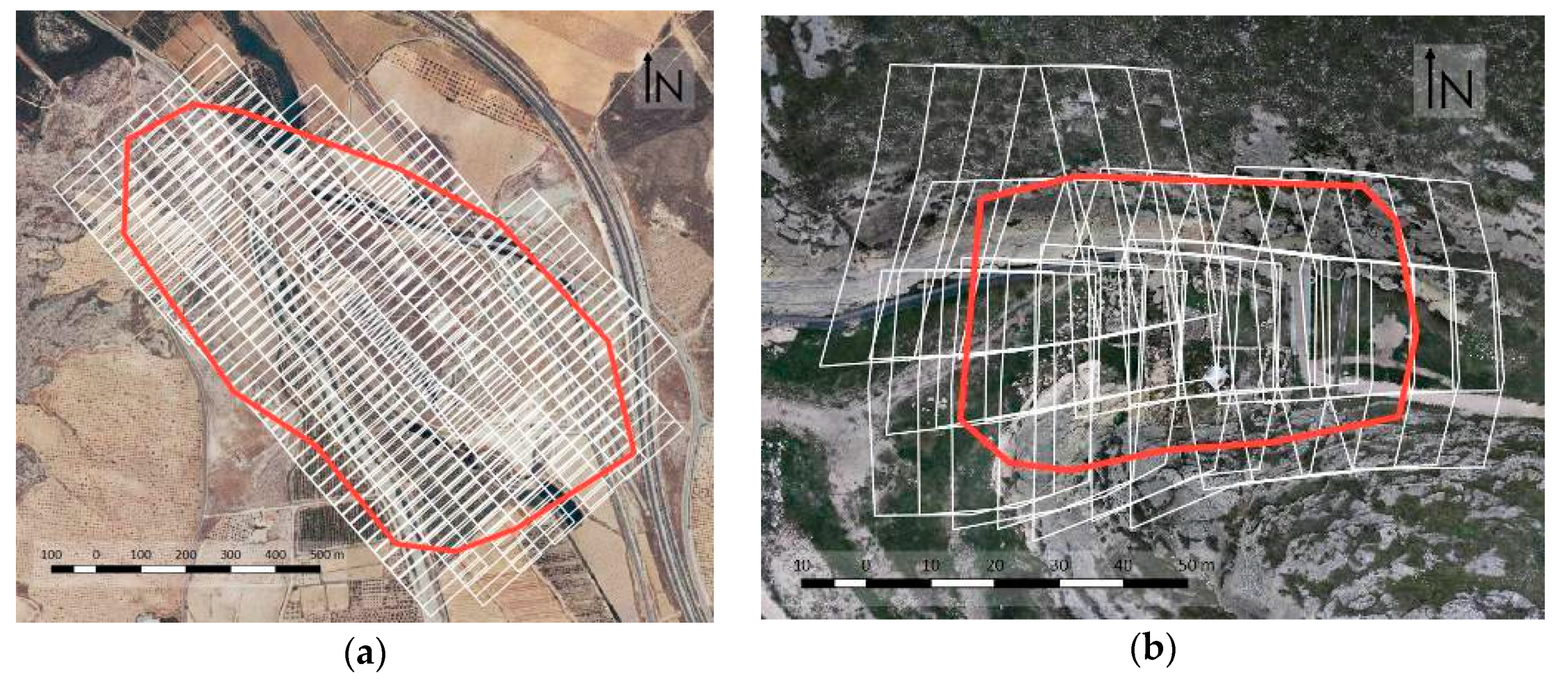 Table 5) acquired the fortified walls with a GSD of 1 cm. Finally, 25 images and a flight height of 32 m guaranteed the desired spatial resolution. The overlap parameters were the same.