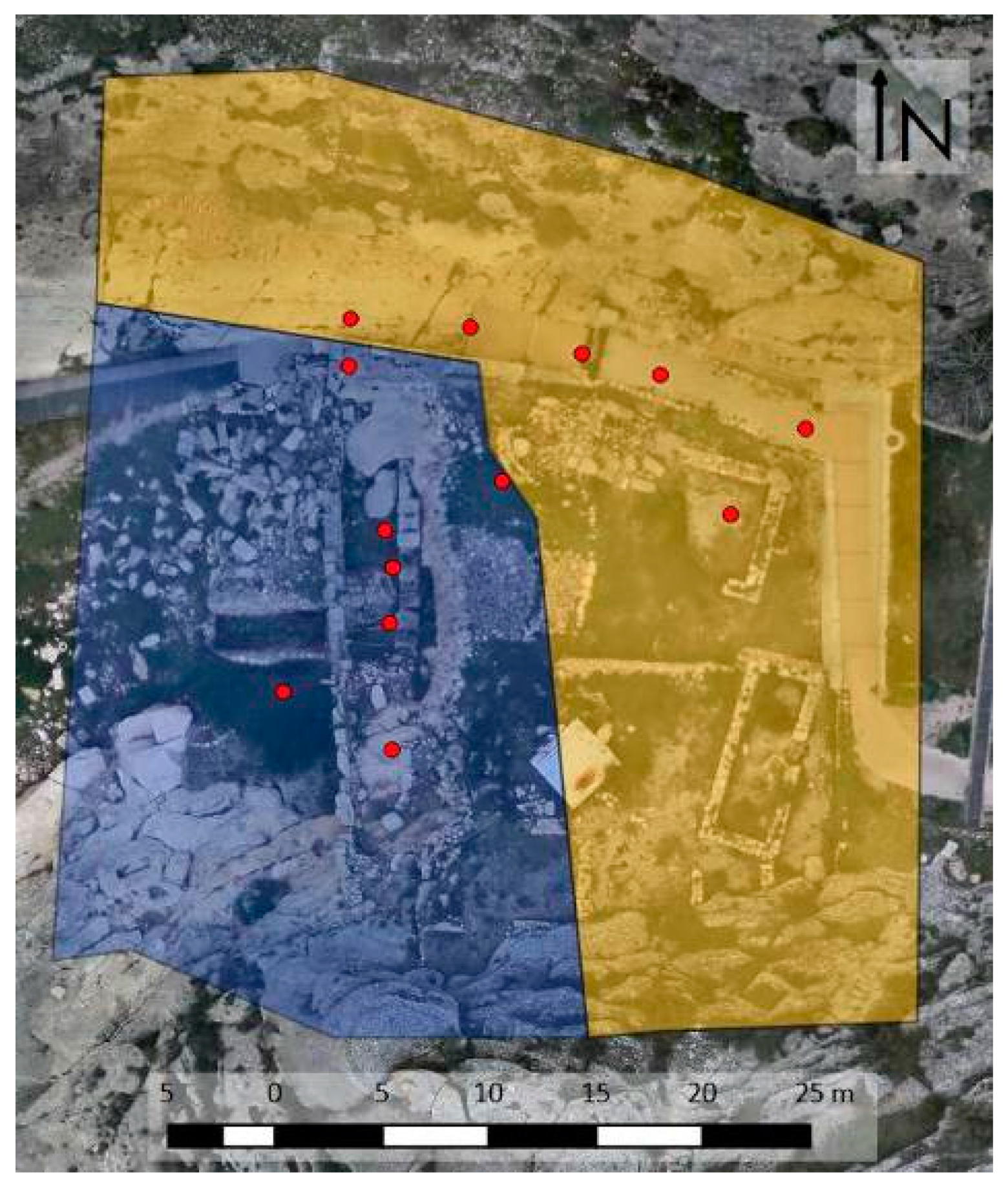 Figure 11 integrates an archaeological sketch of defensive constructions (2012) with the generated hybrid 3D model (2015). It should be noted that the high accuracy and proportion of the sketch is a perfect coincidence of the main homologous entities. However, some detached blocks belonging to the wall of the 3D model do not appear in the sketch. Analysing the position of blocks in the 3D model, it seems that they were spread along the natural drainage bed of the Tolmo, possibly suggesting that a runoff flow took place from the upper part of the Tolmo, providing this current block distribution.