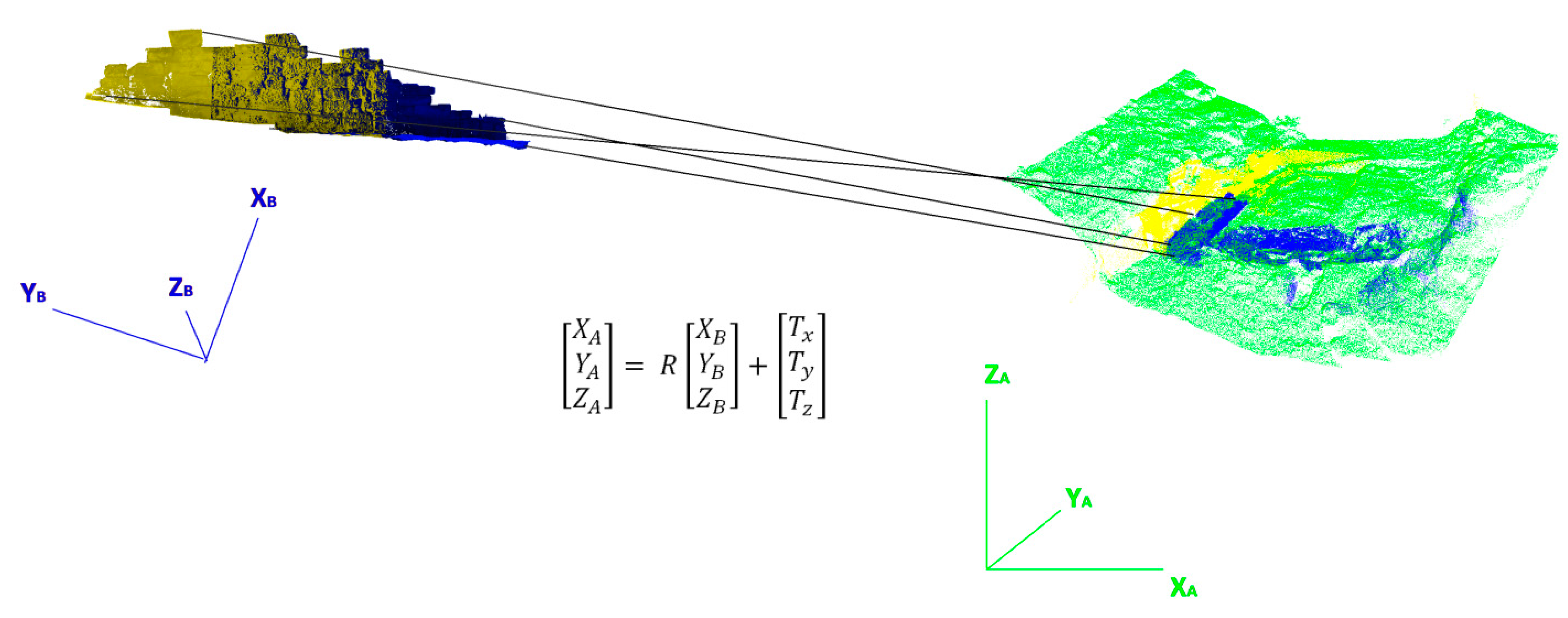 Section 3.2.2. As a result of this process, the raw reconstructed point cloud is obtained which contains 4,271,354 points, while the TLS integrated point cloud reaches up to 1,314,136 points. Secondly, the geo-referencing of the 3D model was solved by the employment of 28 control points homogeneously distributed across the site (but with higher density in the interest area), while ten were used as checkpoints. Finally, the final multi-resolution 3D model after triangulation is obtained (