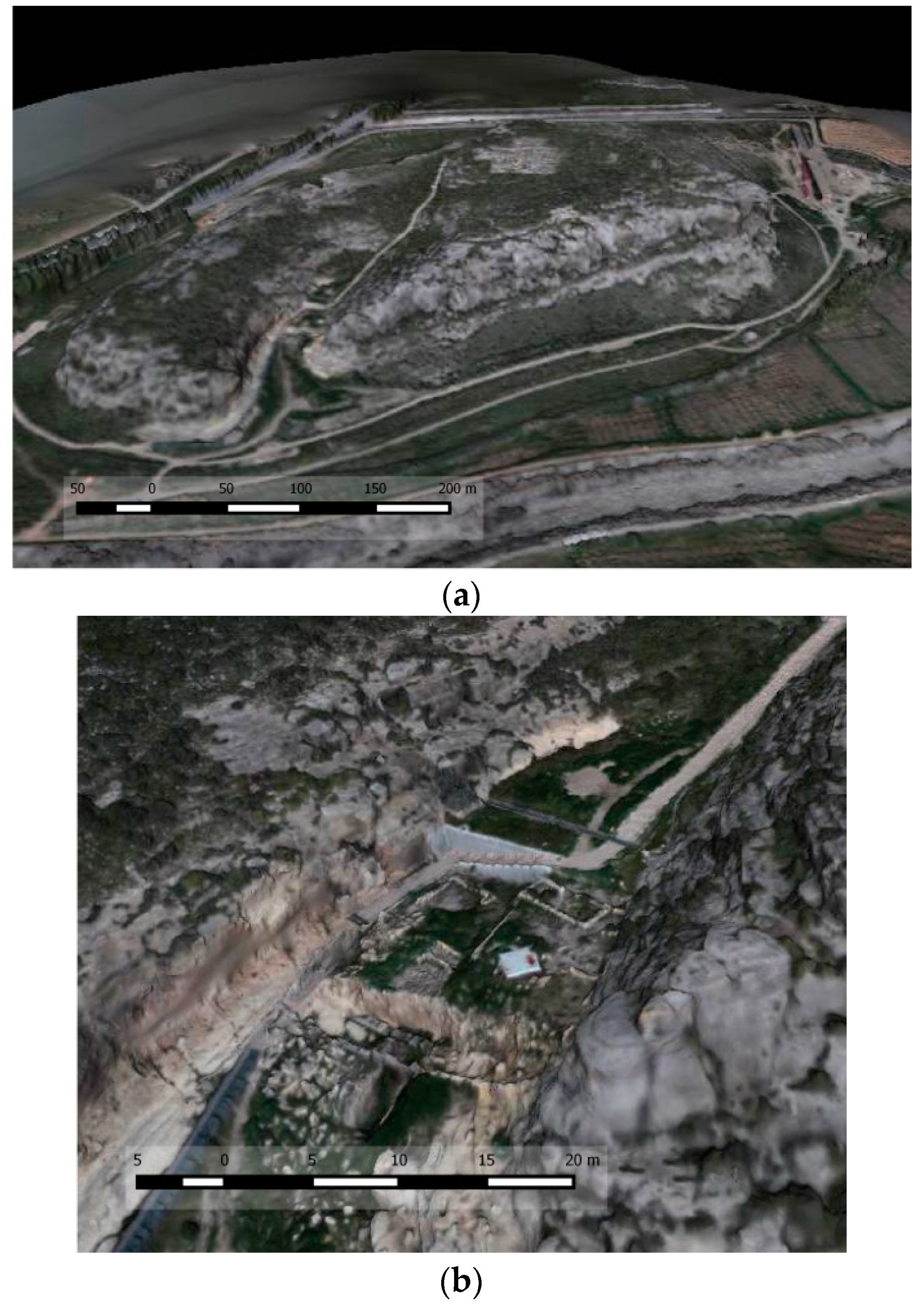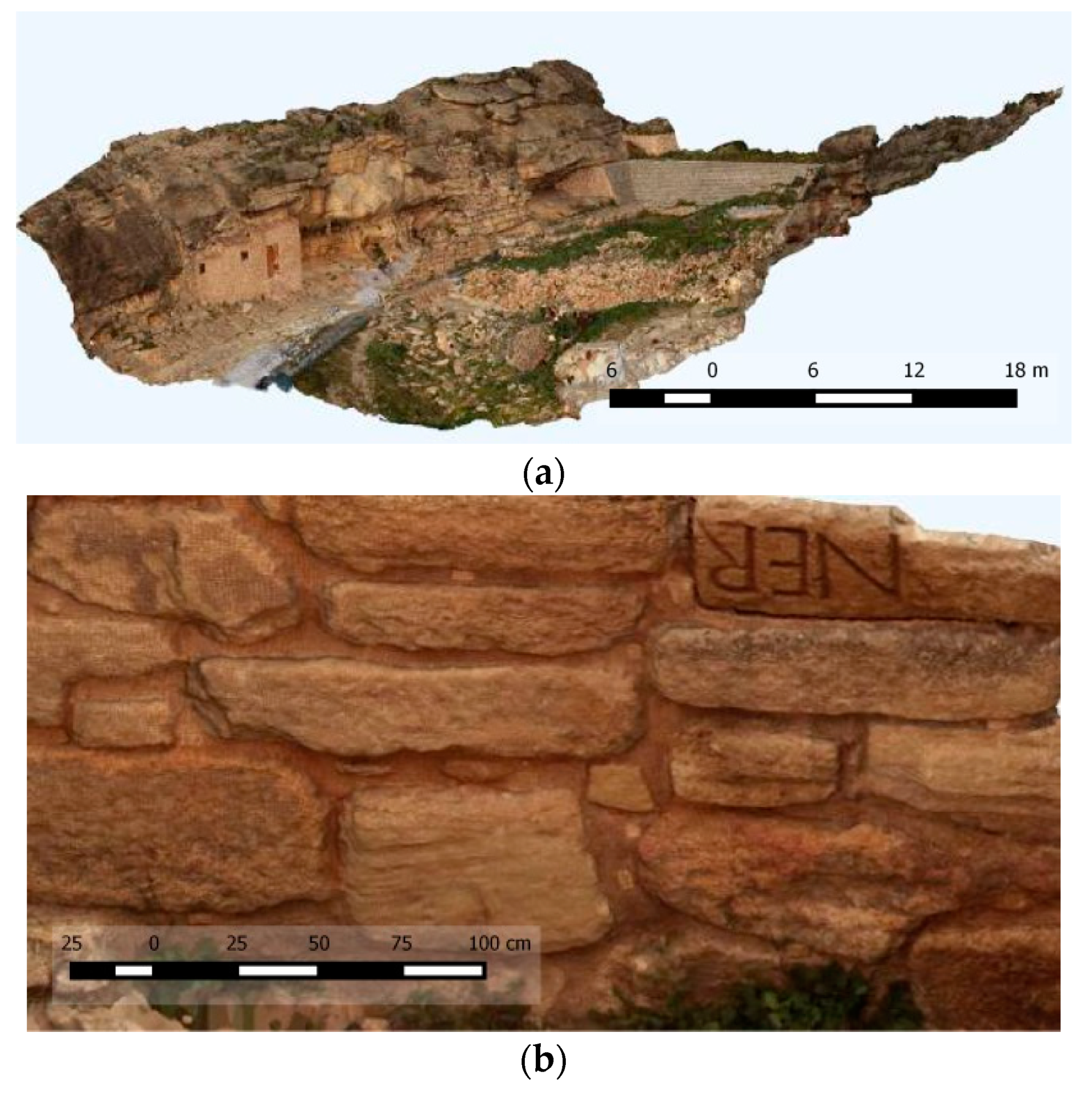 Looking to the smallest and most emblematic elements of “El Reguerón,” it can be confirmed that these correspond to the blocks of the wall, which are bigger than the minimum resolution, meaning that they should be correctly represented. Subsequently, an iterative optimization process of the mesh was performed maintaining relevant information and stopping when the threshold of resolution (10 cm) was surpassed. As we can see in
