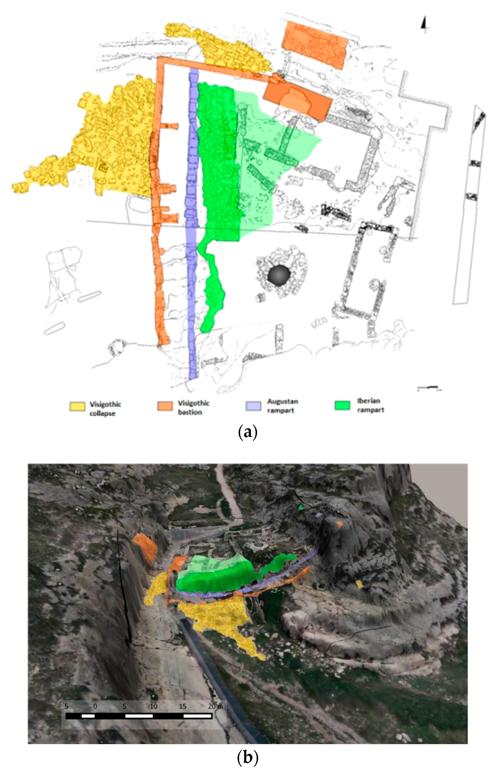 51]. The oldest fortification is represented by the so-called “embanked” wall and was built during the final phase of the Iberian period (4th−2nd century B.C.). Currently, only the remains of a wall 6 m high and 10 m wide at the top, embanked in the external front and built in irregular masonry work, was preserved in the soil. During the archaeological excavation of this ancient wall, an earlier phase, which dates back to the Middle Bronze Age, was discovered. The Iberian wall was successively used as a retaining wall for a new fortification building during Roman times when the “Tolmo de Minateda” probably received the title of municipality.