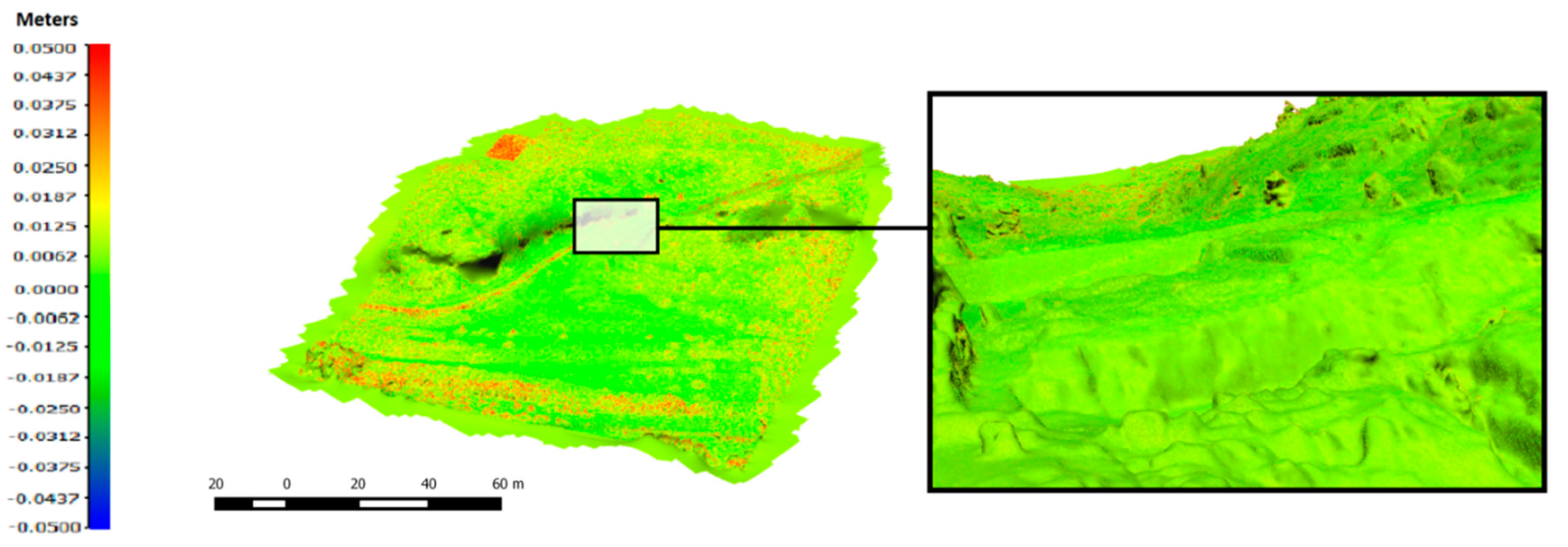 Figure 12, higher discrepancies are located in peripheral areas due to the presence of vegetation with an irregular typology. Conversely, the walled area exhibits minimum discrepancies always less than ±5 mm.