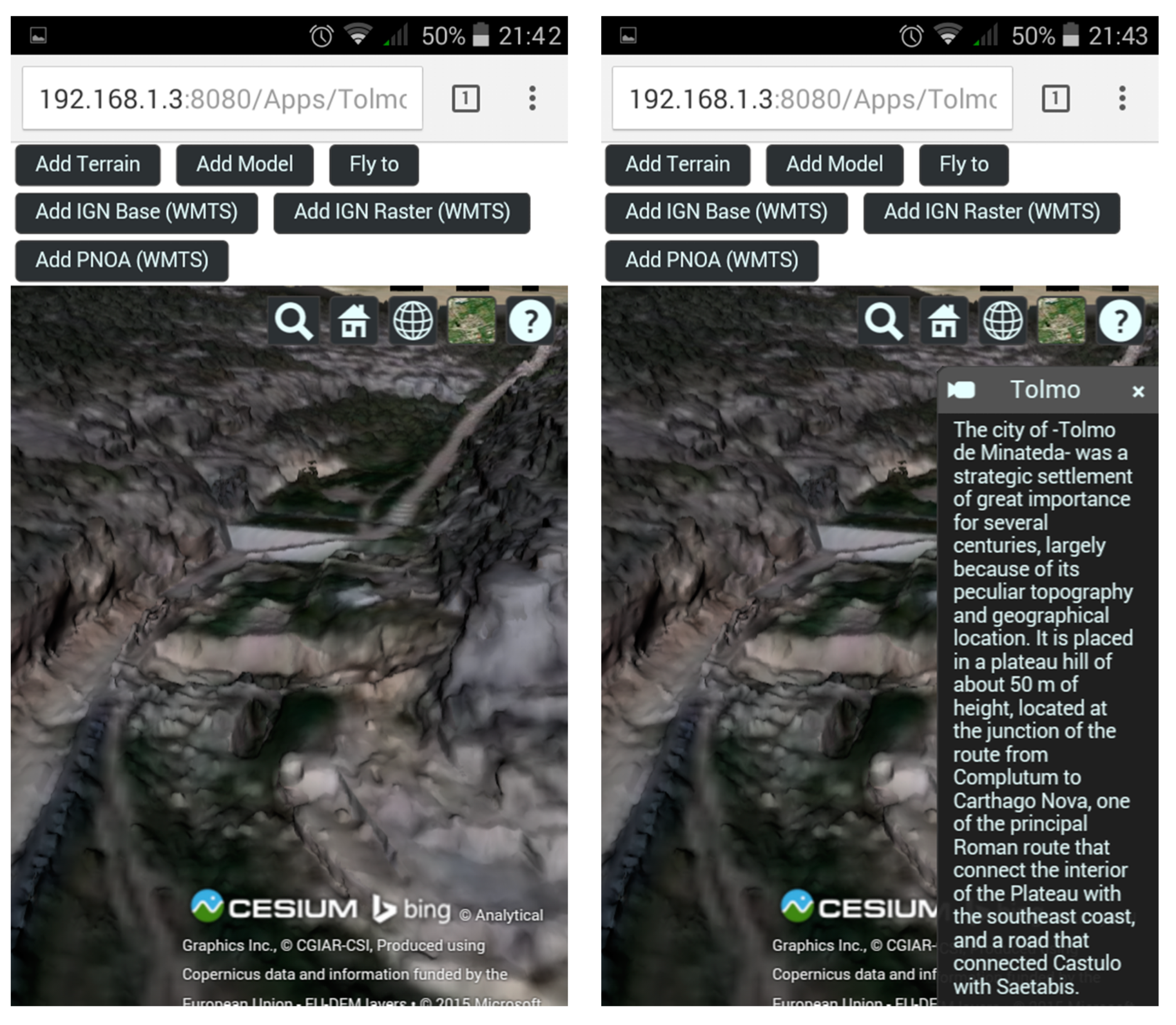 Finally, results were presented through the Web based on the Open Source library Cesium. A specific template based on HTML language was prepared to show the 3D models and additional information using external geospatial services such as WMS, MapServer, Google Earth or Bing, among others. Thanks to the flexibility and portability of the mobile devices, it was possible for the archaeologist to interact directly with the platform at the field: recording data and adding new information with corresponding attributes and descriptions. An example is outlined in