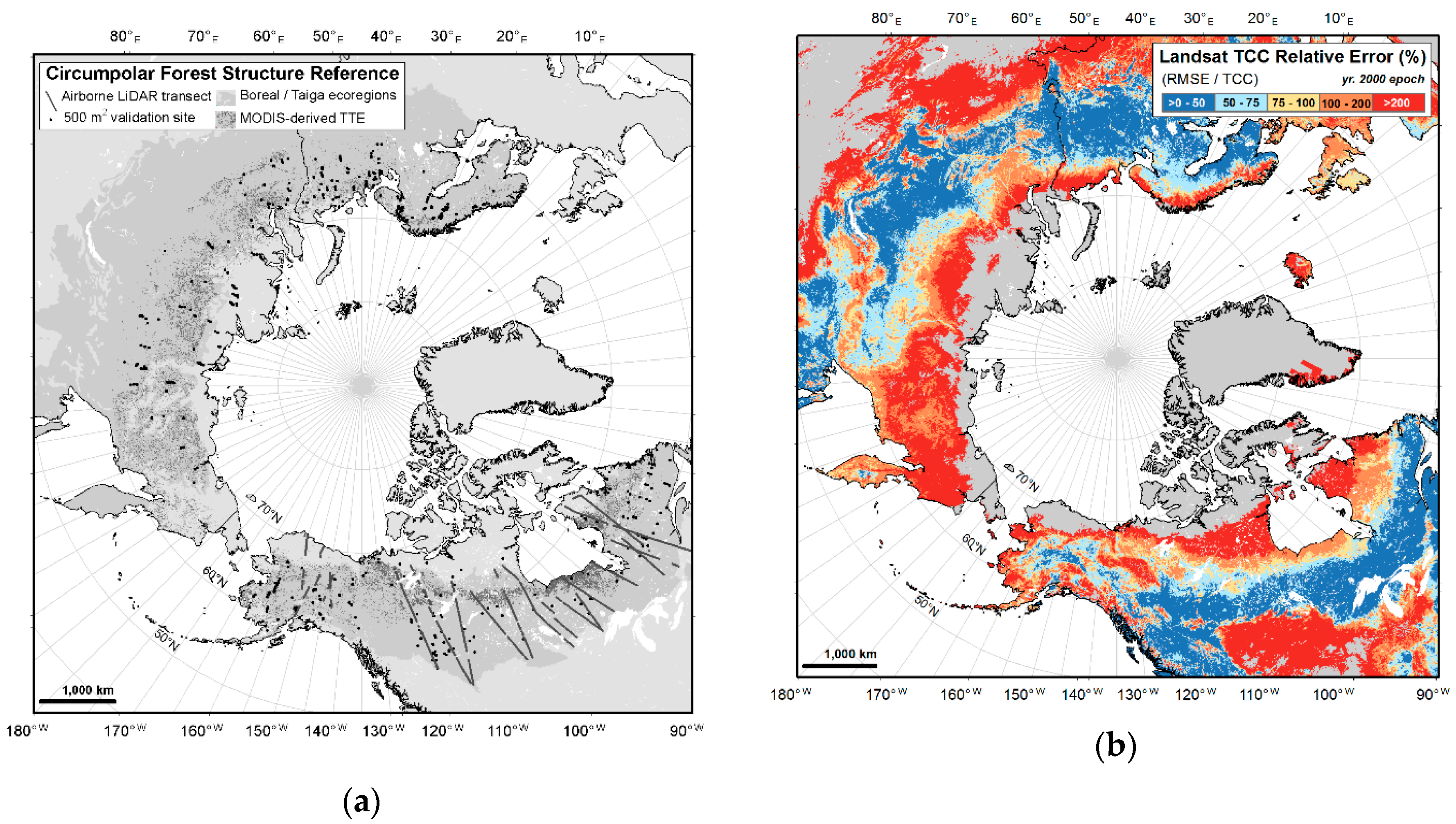 Maps showing circumpolar boreal and TTE forest structure reference data: (a) The 425 individual validation sites (500 m2) provided a circumpolar set of reference tree canopy cover and the ~553,640 samples in Alaska and Canada that were collected along boreal-tundra transects with airborne LiDAR that provide tree canopy cover and height estimates at 30 m segments; (b) Mapped categories of pixel-level uncertainty (TCC relative error) from the year 2000 epoch of Landsat TCC estimates from Sexton et al. [34] in the circumpolar boreal and TTE regions.