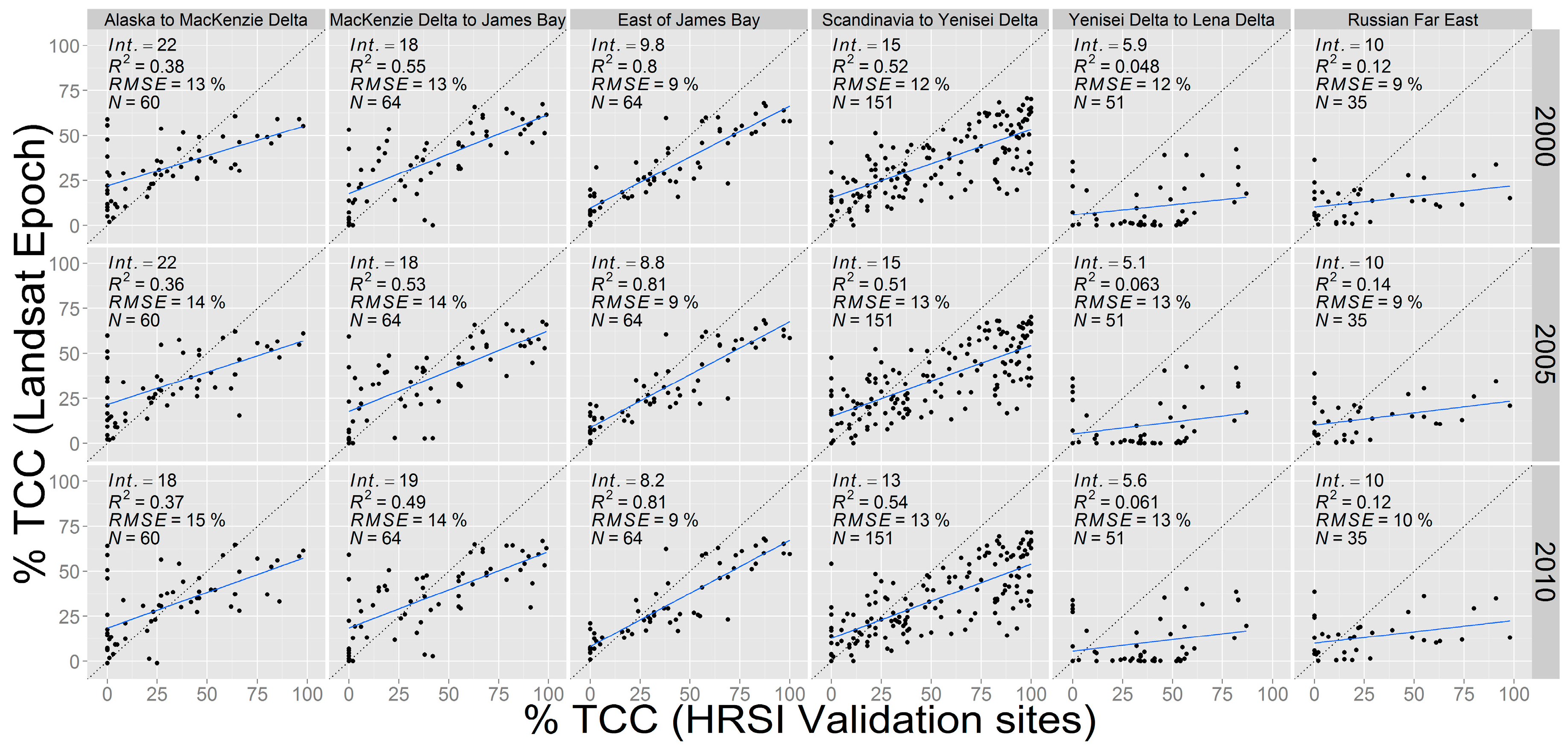Scatterplots showing linear models relating mean Landsat TCC estimates at 425 circumpolar HRSI validation sites. The 425 sites, divided into six regional circumpolar zones, provide reference tree canopy cover for Landsat TCC for three epochs.