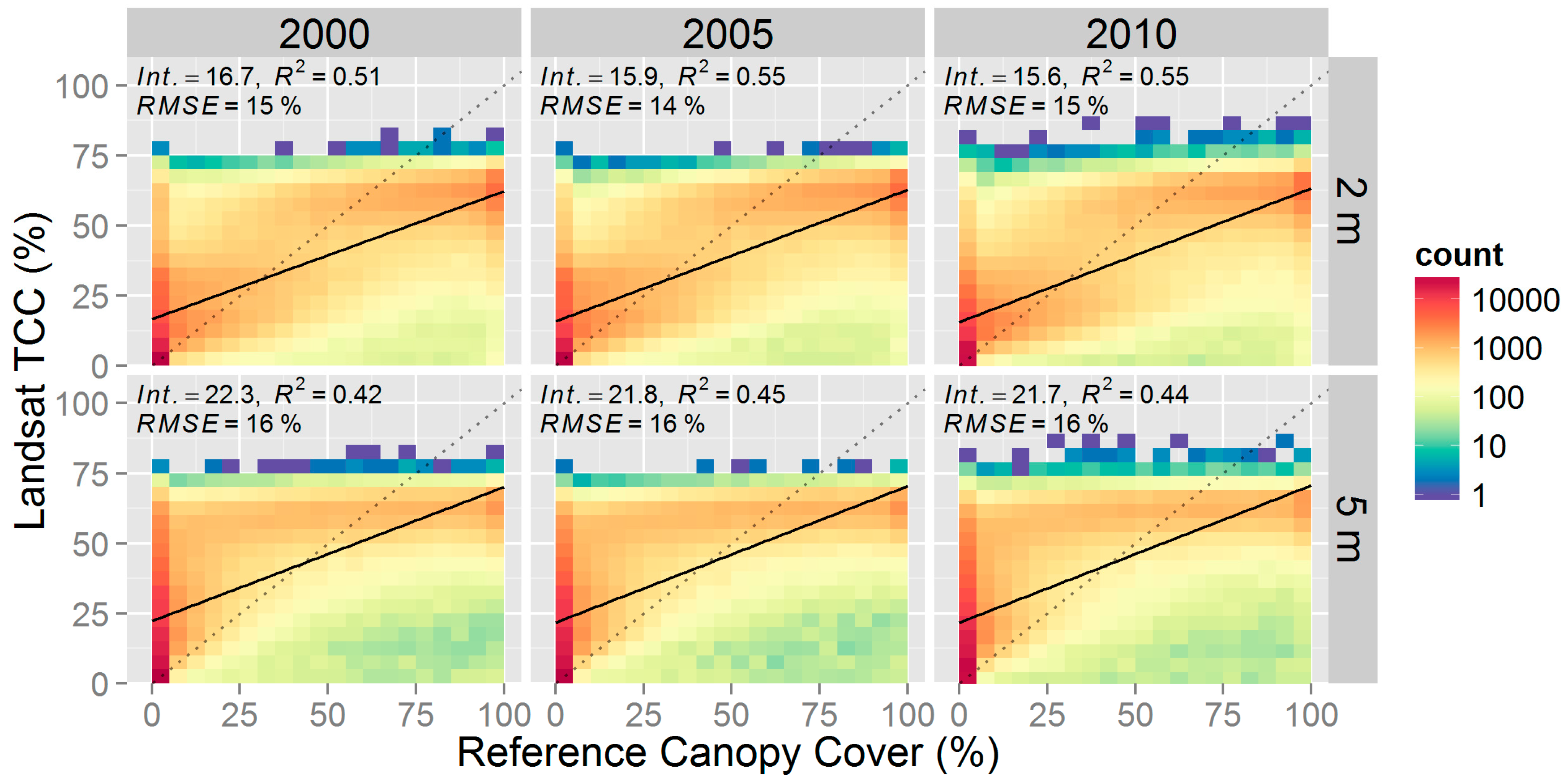 The model summary also reports model uncertainty (RMSE) and its systematic (RMSES) and unsystematic (RMSEU) components. These uncertainty figures provide an estimate of the mean error of the Landsat TCC values. The RMSES (error in the x-direction) and RMSEU (error in the y-direction) show the contribution to overall model error associated from the reference estimates and the Landsat estimates. Each epoch’s 2 m model reports TCC uncertainty (RMSE) of 29.0%, 27.1% and 31.1% for 2000, 2005 and 2010, respectively, with those from the 5 m model report 28.0%, 26.5% and 31.5%.