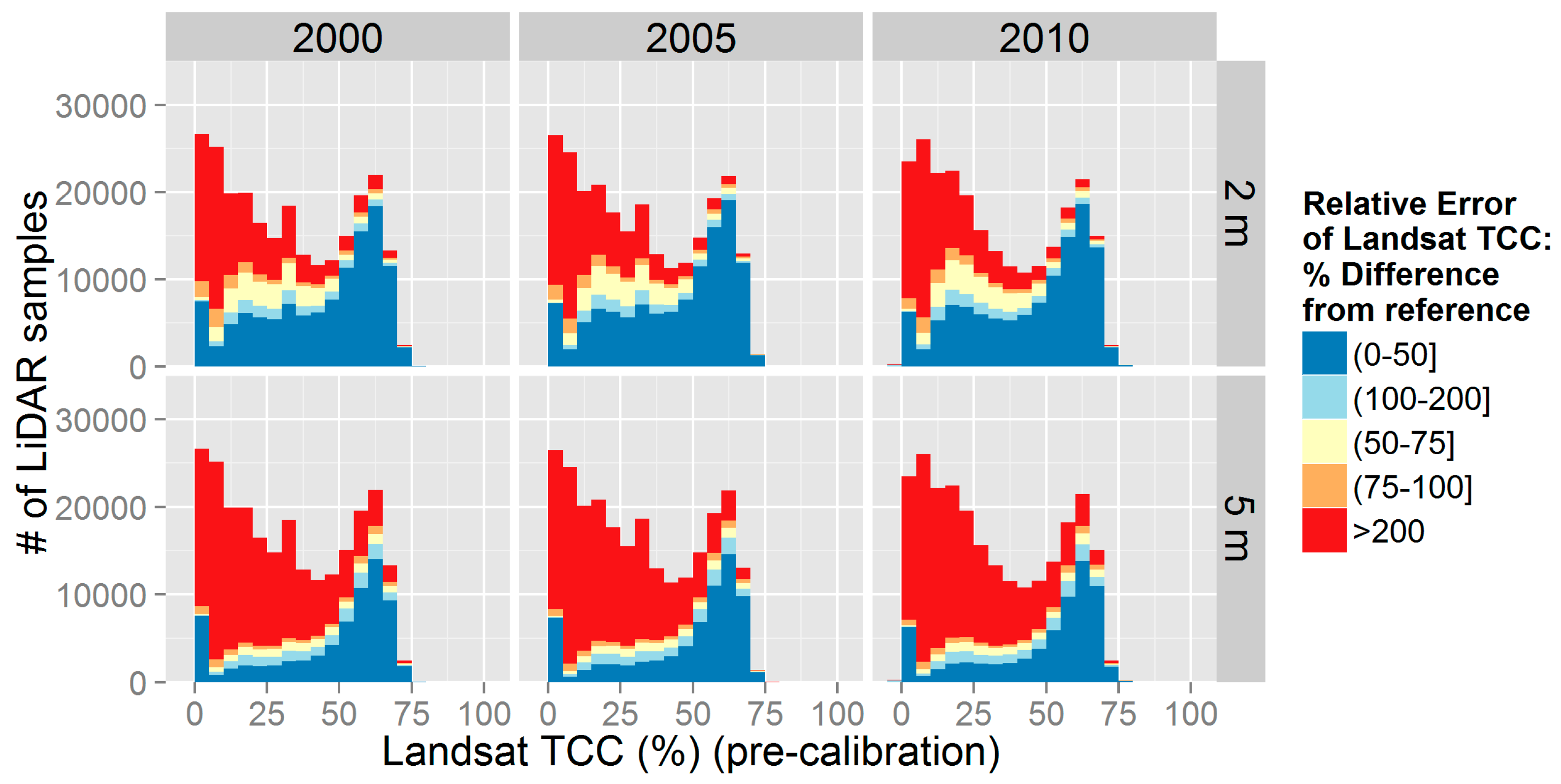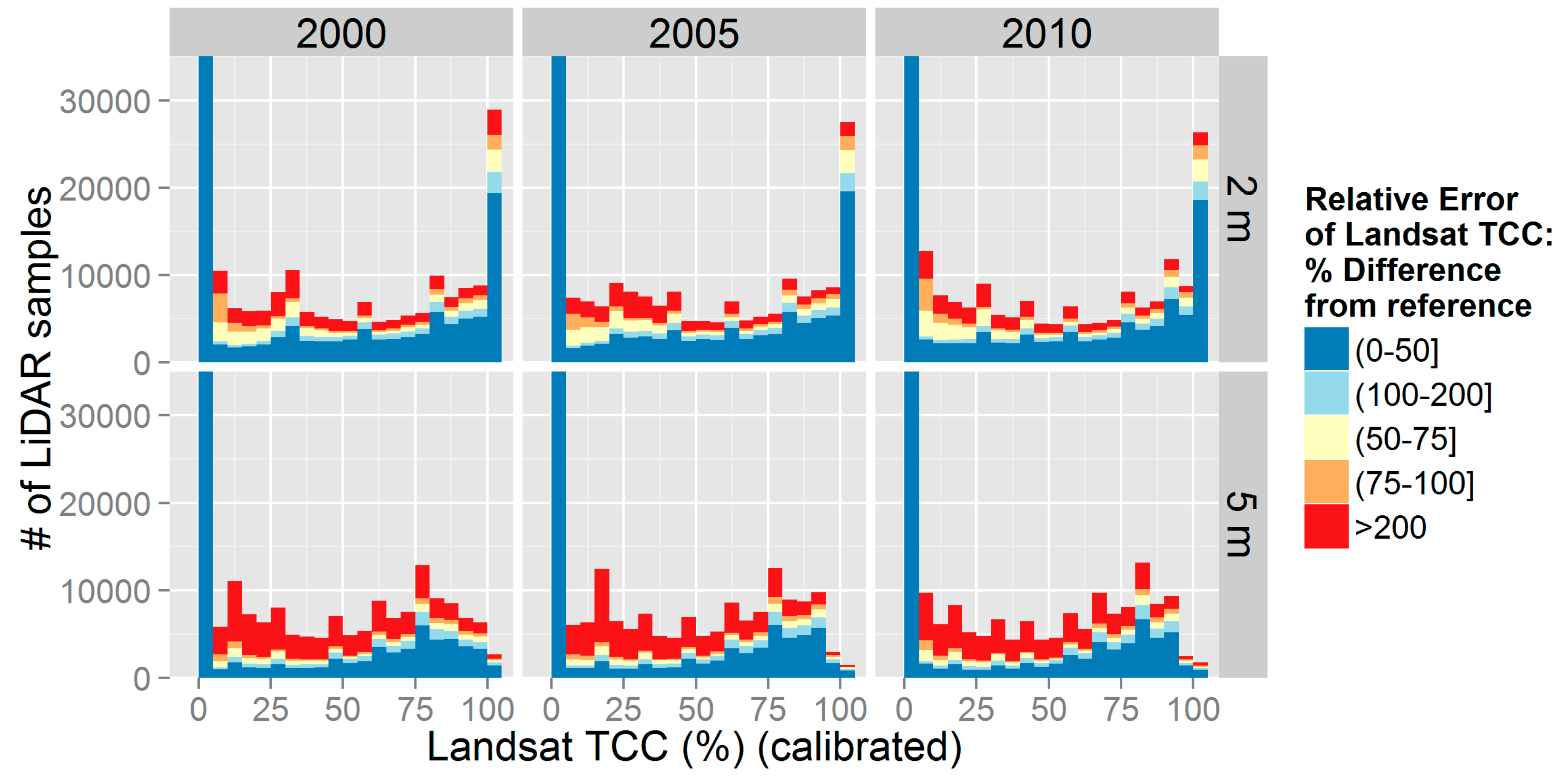 We calculated the Landsat TCC relative error for each airborne LiDAR sample. The relative error was defined for each sampled pixel as such: