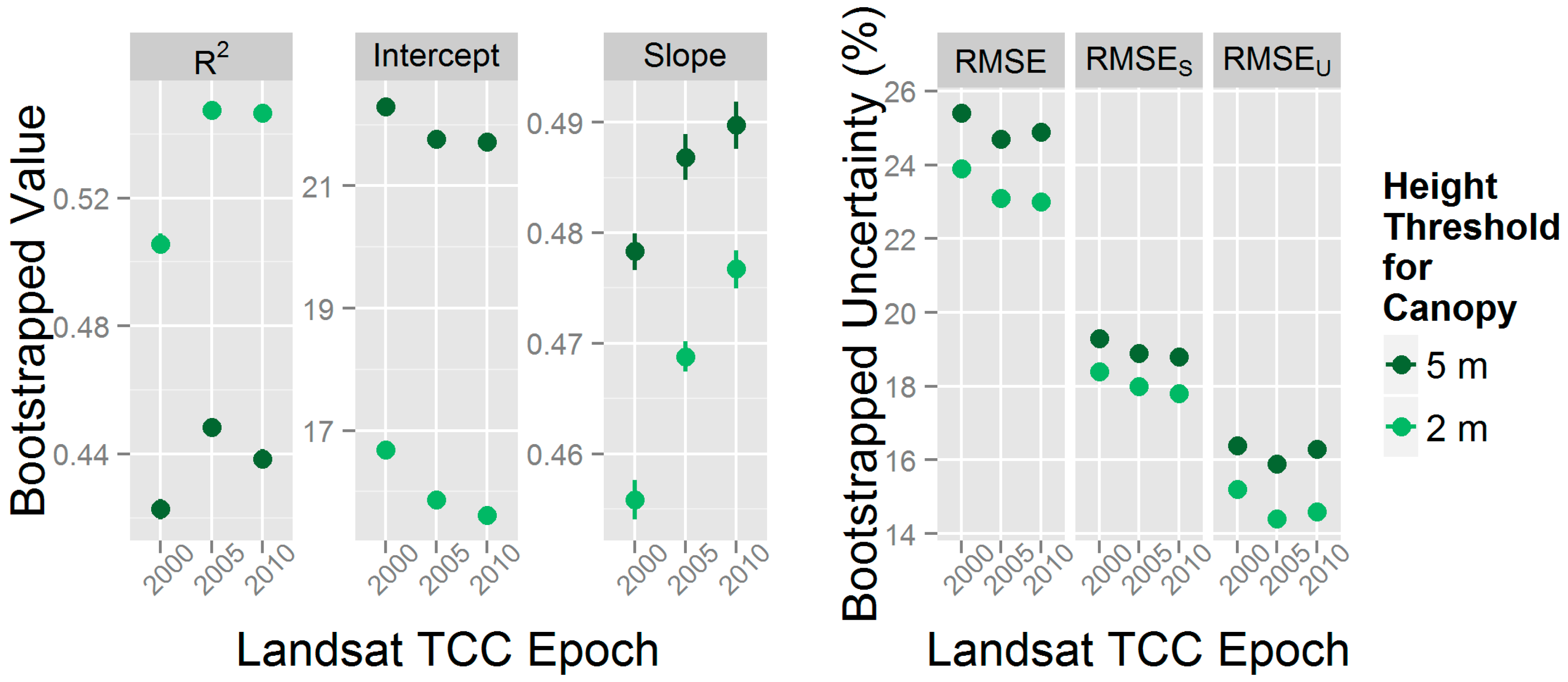 The set of LiDAR reference data was divided so that half was used for model calibration and the other half for model validation. Both model training and testing sets were distinct in that they had no samples in common. The calibration models, specific to epoch and canopy height threshold, were built based on bootstrapped linear model coefficients derived from the set of model training data. These coefficients, because of the large training sample size (N = ~250,000), had very small confidence intervals at the 95% level (Figure 6).