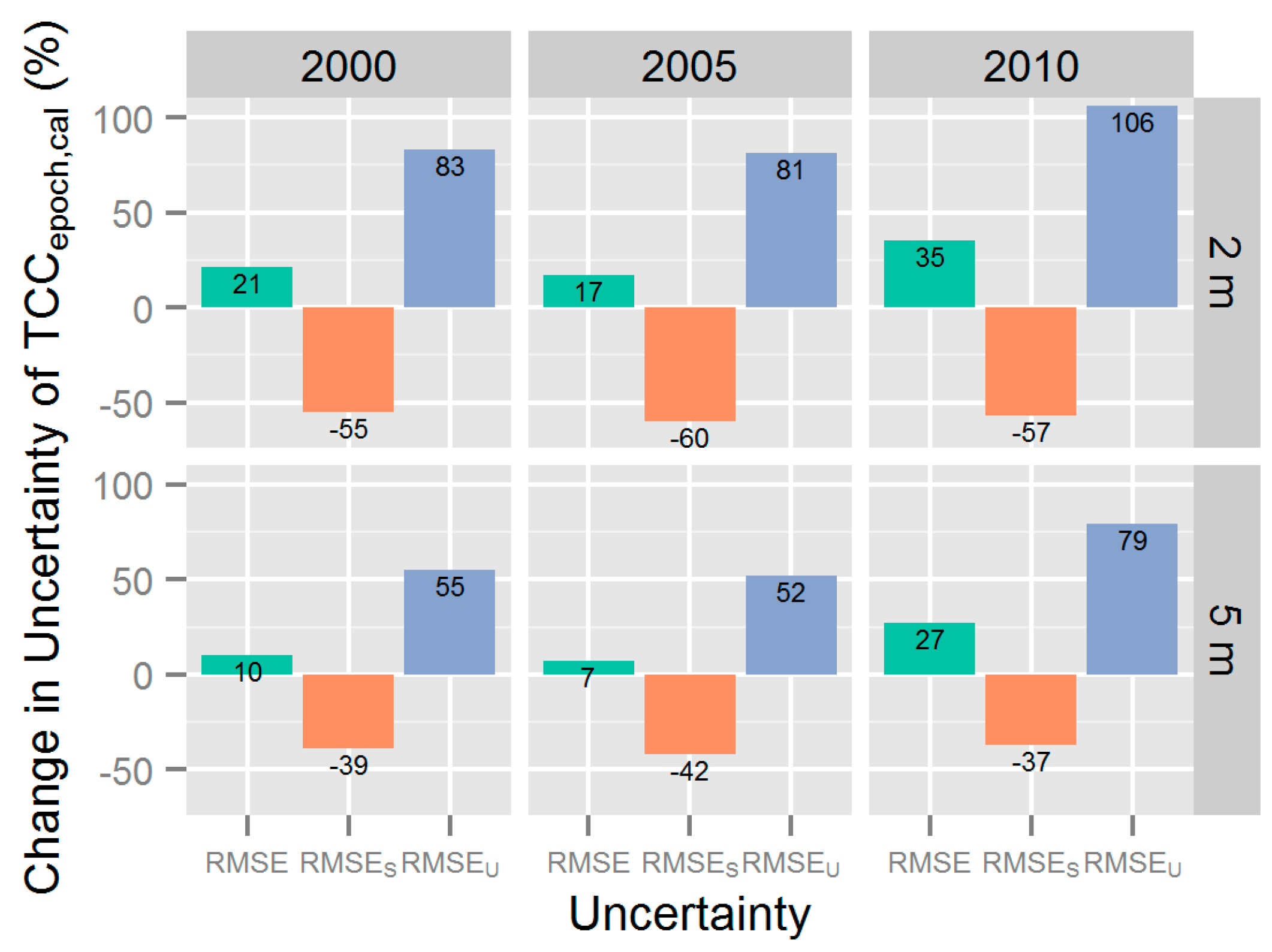 The differences in TCCepoch and TCCepoch,cal systematic (RMSES) and unsystematic (RMSEU) uncertainties provide the context needed to compare the overall uncertainties from each epoch’s model. Figure 8 reports these differences in Landsat TCC uncertainty estimates from comparison with reference estimates based on 2 m and 5 m canopy height thresholds. These pre- and post-calibration results show how the calibration has reduced systematic error and increased the unsystematic error associated with the model residuals of Landsat TCC. For the 2 m models, these differences result in a larger overall RMSE (increases of 17%–35%) after removing 55%–60% of the systematic contribution to the overall error, resulting in TCCepoch,cal uncertainties of 29.0%, 27.1% and 31.1% for 2000, 2005 and 2010, respectively, that reflect more closely the uncertainty of TTE tree canopy cover from Landsat relative to the external reference data.
