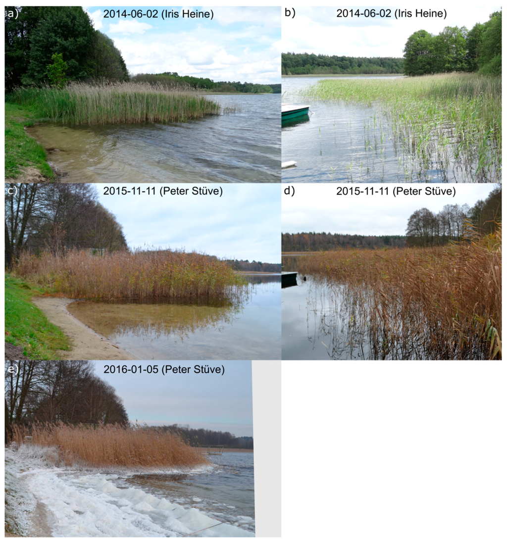 The phenology of reed is characterized by strong growth in April (mainly stem) and May (stem and leaves). By the end of June the maximum leave area is reached. In August the reed blooms and only the rhizome continues to grow [2,51]. Between October [51] and November/December [2], depending on the literature, the leaves of the reed start to wither and fall off. On 11 November 2015 the leaves were withered, but most were still attached to the stems (Figure 3). Unfortunately, no photos were taken at the end of 2014, so the actual phenological state of the reed in November 2014 is unknown. The withered stems of the reed keep standing [1,2] unless they are cut off by moving ice. The cut off of reed is very unlikely in the study area, according to an expert (Peter Stüve) for Lake Fürstenseer See. The time lapse video vaguely shows the development of the first leaves on the reed and the very clear development of the leaves of the deciduous trees between 9 April 2015 and 6 May 2015.