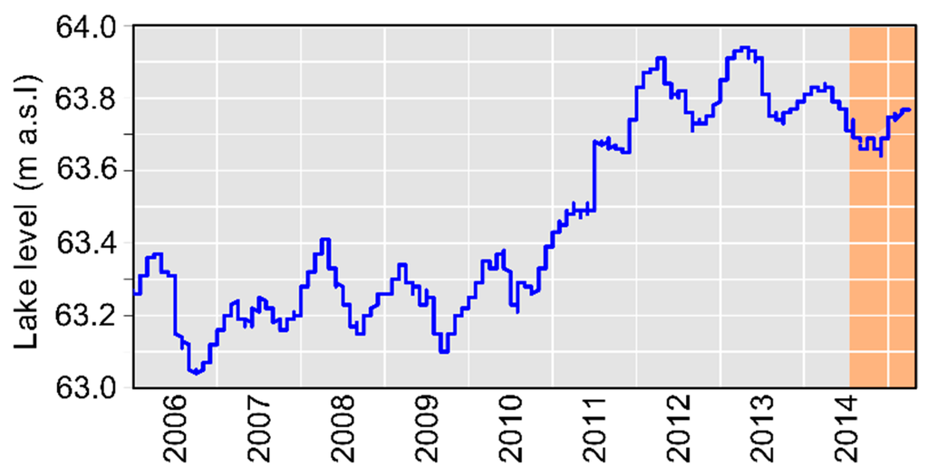 The shoreline of the lake is heterogeneous with respect to land cover and shoreline topography, and is little influenced by human activity, except for small bathing sites in the southwest and southeast areas of the lake. The shoreline topography varies with very shallow areas in the southern part and steeper shorelines in the northeastern part of the lake [9] (cf. Figure 2). The shallow shorelines in the southwest of the lake are densely covered with reeds, as is visible in Figure 3, whereas the southeastern is part only sparsely covered. This difference may be caused by lake level changes in the last decade and the use of the southeastern shoreline as a bathing site. The lake level changes in the last decade ranged around 1 m (cf. Figure 4): in October 2006 the lake level fell to a local minimum of 63.4 m a.s.l. In 2011 there was a significant increase, causing the level to range around 63.8 m (cf. [29,33]). Shallow shoreline areas and a sandbank fell dry during the local minimum in 2006/2007 [9]. The southeastern shoreline was at this time a sandy beach without reed vegetation. Generally, the reed belts at the shoreline move with the decreasing and rising lake level, as long as the changes are not too abrupt [1,35].