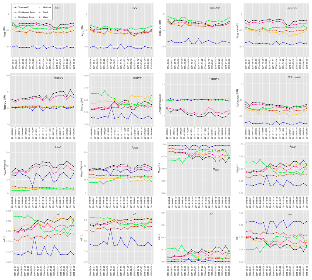 The best separation of reed areas from the other classes by the mean values of the observed parameters is achieved in winter by the double-bounce–sensitive parameters δ H H V V , δ H H / V V , γ H H V V , ¯ d u a l and d u a l . Especially δ H H V V and δ H H / V V have proven useful in the classification of flooded vegetation in [25,53]. The mean values of d u a l are more extreme than the mean values of ¯ d u a l and the seasonal variation of the parameter d u a l is more pronounced. Hence, d u a l appears more suitable for the separation of reed according to the investigations in Figure 5. Reed has predominantly the highest mean δ H H values and they are higher than δ V V during the entire monitoring period (cf. [25]). However, δ H H has a high probability of confusion with deciduous forest because, especially in spring, the mean values of δ H H   differ only by 2 dB to the ones of reed. The parameter δ X X , p s e u d o , is an indicator of vegetation scattering [20,52], and also reacts to reed as well as forest. Thus, δ H H and δ X X , p s e u d o are very suitable for the distinction of reed and water (no volume scattering on the lake surface), but not for the distinction of reed and deciduous forest. Another problem is the dependence on the look direction of the co-polarized intensities (HH, VV): in Figure 6 the dependency of the look direction results in higher values near the shorelines in the range direction in channel δHH-VV. H d u a l and A d u a l , and consequently also the scattering mechanism from the dual-polarimetric H-A-combinations, show a high similarity of reed and meadow, probably because of a similar phenology. During leaf fall and growth, confusion with scattering from deciduous forest is also possible. As such, δ V V ,   δ H H + V V , and | γ H H V V | are the parameters that are least distinct in their mean values. They have a high likelihood of confusion of reed with other various classes. Thus, δ H H + V V  indicates direct surface or odd-bounce scattering [25] and the mean value for reed is, in winter, nearly identical with the values for scattering from meadows and coniferous forest. In summer, the mean value of reed lies between the mean value of deciduous forest and the values of meadow and coniferous forest, but the probability for confusion is still critical. The parameter | γ H H V V | of reed is, in summer, nearly identical with that of coniferous forest; the rest of the year, | γ H H V V | of reed is also similar to those of meadow and deciduous forest.