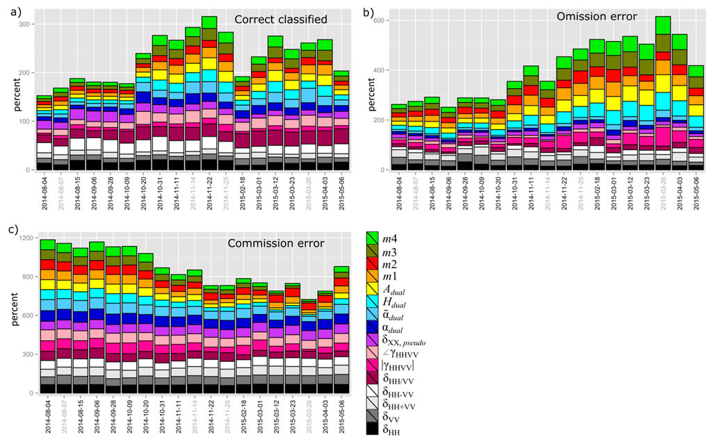 Figure 7. Classification accuracies of each observed polarimetric parameter stacked for each date. The proportions within each stack are sorted from the bottom to the top. The correct classified proportion (a); omission error (b); and commission error (c) are illustrated seperatedly. The colors of each parameter are the same for all graphs. The labels of the dates are grey for asc images and black for desc images.