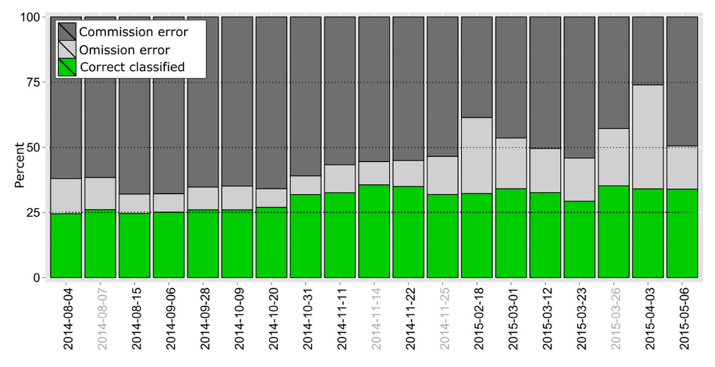 Figure 8. Classification accuracies for each acquisition date in percent. Basis for the classification was stacks of all observed polarimetric parameters. For the evaluation the classification result was clipped to the area of Lake Fürstenseer + 50 m buffer. The correct classified proportion is illustrated in green, the commission error (false positive) in dark grey and the omission error (false negative) in light grey. The labels of the dates are grey for asc images and black for desc images.