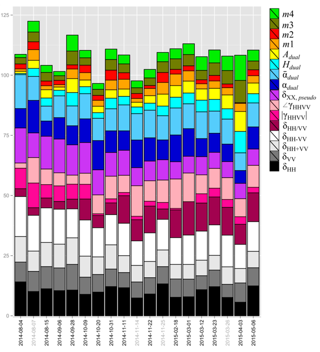 For the 10 ice-free images between 20 October 2014 and 3 April 2015, δ H H V V is always one of the five most important variables.. δ H H and ¯ d u a l are on eight, δ H H / V V and γ H H V V , p h a s e on six, δ X X ,   p s e u d o on four and d u a l on three dates the most valuable variables. Thus, the variable importance for RF classification is determined by the sensitivity to double-bounce scattering and also by the spatial variability of the parameter: the spatially homogeneous parameters δ H H V V , ¯ d u a l and δ H H / V V and the spatially variable parameters γ H H V V , p h a s e , d u a l reach high importance because they react very well to the double-bounce of reed in winter. However, δ H H and δ X X ,   p s e u d o are spatially homogeneous and partly sensitive to vegetation, and they do not show sensitivity to an increase of double-bounce scattering in the time series.
