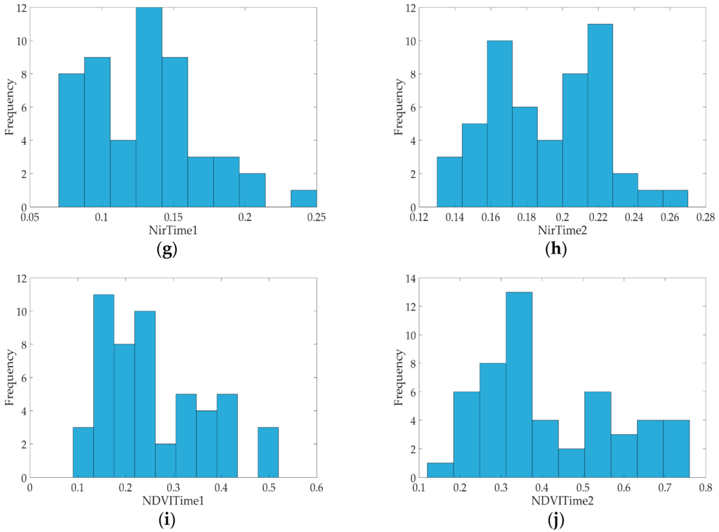 Histograms for the 10 satellite-derived variables. These distributions were obtained after plotting the mean values of the two sets of CBI plots, for each band and each different image (GeoEye 2011 and 2012); (a) blue band histogram for the year 2011; (b) blue band histogram for year 2012; (c) green band histogram for the year 2011; (d) green band histogram for the year 2012; (e) red band histogram for the year 2011; (f) red band histogram for the year 2012; (g) NIR band histogram for the year 2011; (h) NIR band histogram for the year 2012; (i) NDVI band histogram for the year 2011; and (j) NDVI band histogram for the year 2011.
