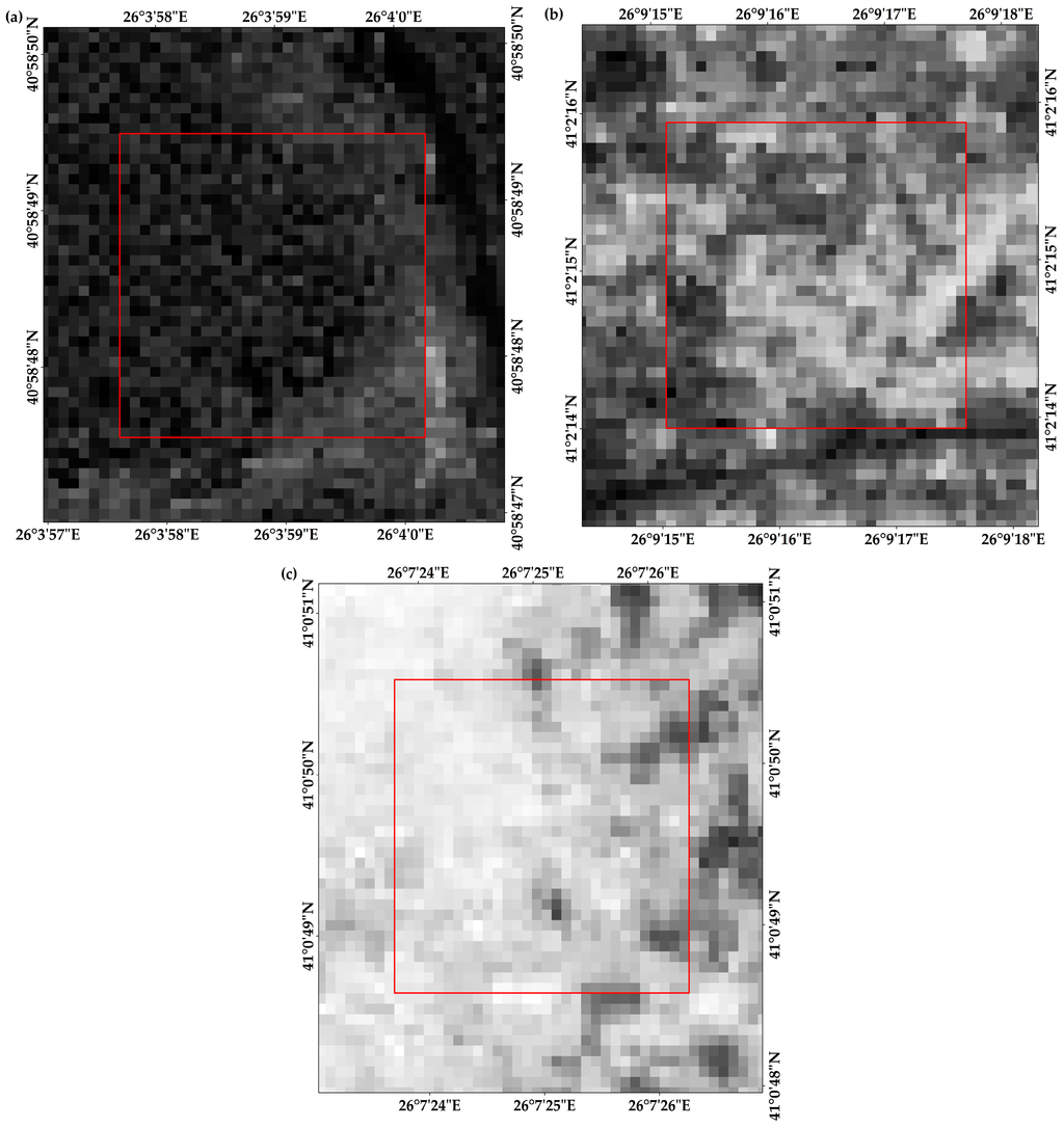 Visual representation of the NDVI variability in three different burn severity field plots. The areas delineated with red are the 60 m × 60 m CBI field plots. (a) NDVI values within a high-severity CBI plot; (b) NDVI values within a moderate-severity CBI plot; and (c) NDVI values within a low-severity CBI plot. The background of the figure is the 2011 NDVI image.