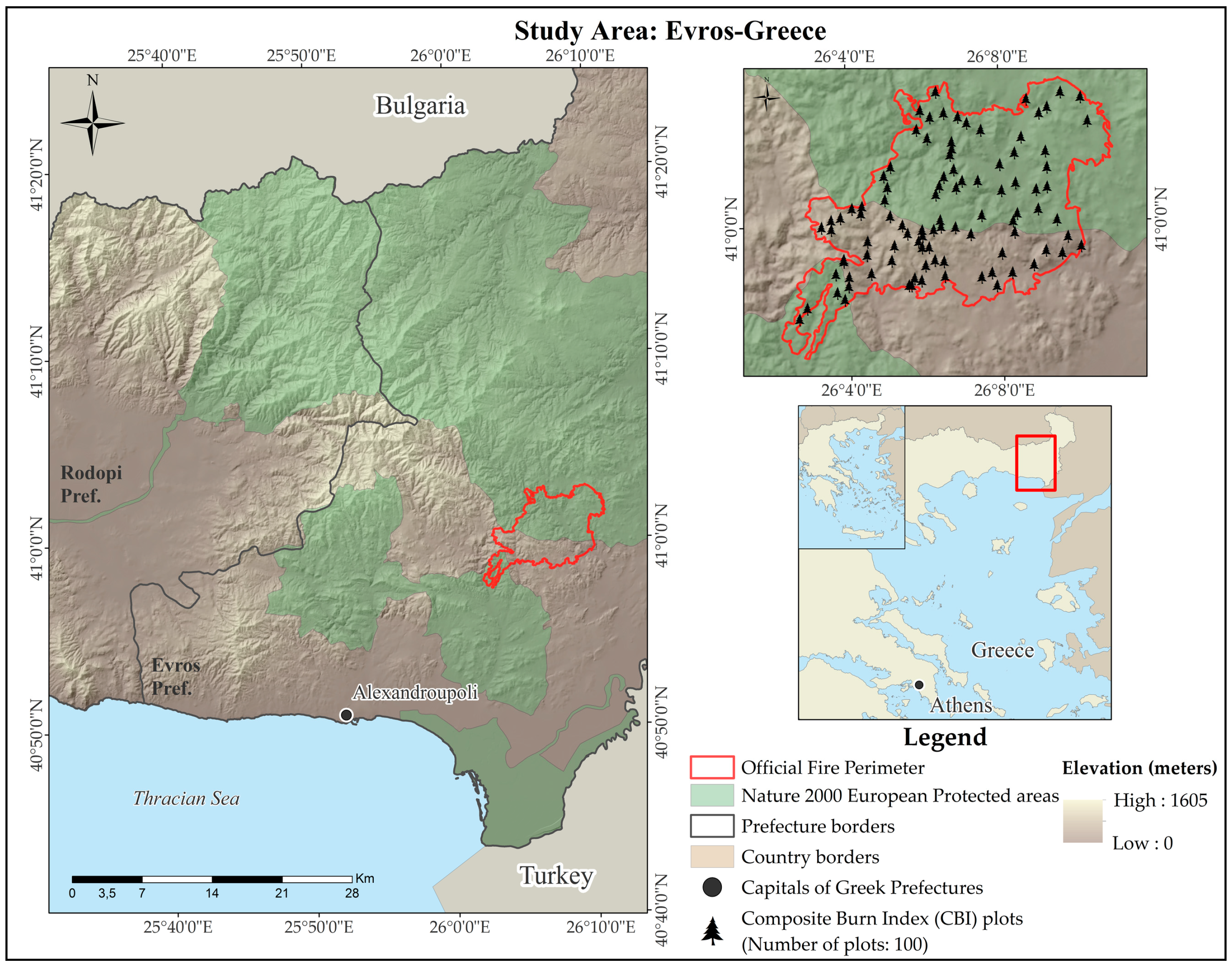 Location of the study area. The area delineated with red is the area of Evros (Greece) which was severely affected by a large fire in August 2011. The detail on the upper right depicts the locations which were visited in the field in order to measure the Composite Burn Index (CBI).