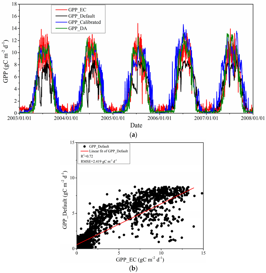 Results of default, calibrated, and assimilated GPP: (a) Performances of GPPs from the EC measurement, default, calibrated and assimilated Biome-BGC; (b) comparison and validation of GPP values from the EC measurement and default Biome-BGC; (c) comparison and validation of GPP values from the EC measurement and calibrated Biome-BGC; (d) comparison and validation of GPP values from the EC measurement and assimilated Biome-BGC.