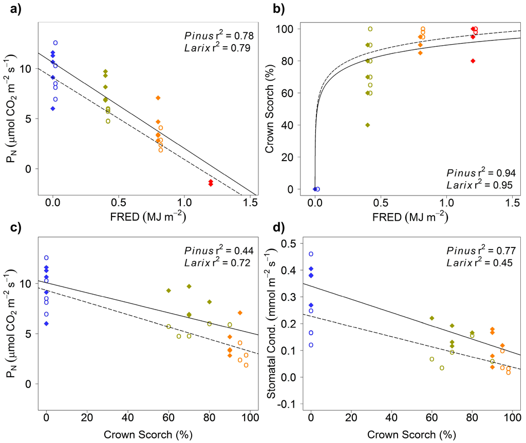 Increasing FRED dose leads to increasing crown scorch and lower leaf physiological performance. Scatterplots display four week post-fire data with colors representing FRED doses: blue = control, yellow = 0.4 MJ·m−2, orange = 0.8 MJ·m−2, and red = 1.2 MJ·m−2, and solid markers representing Pinus and open markers representing Larix. The solid and dotted lines represent predicted values for Pinus and Larix four weeks post-fire, respectively. Sub-plots are as follows: (a) leaf PN predicted from FRED (adapted from [8] to include a comparison with Larix) and (b) crown scorch predicted from FRED; (c) PN predicted from crown scorch; and (d) stomatal conductance predicted from crown scorch.