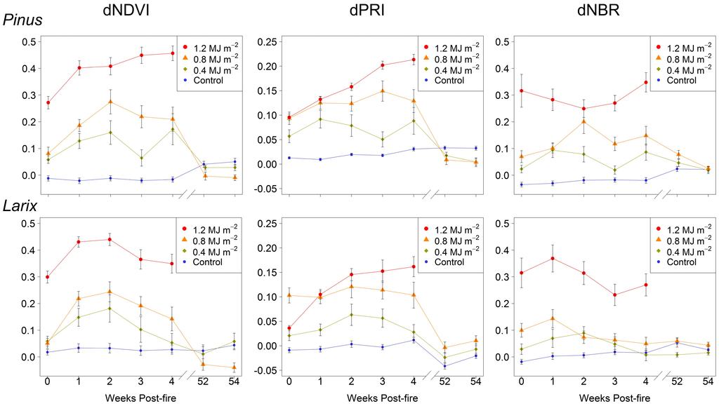 The temporal trajectory of all spectral indices for the high FRED dose seedling group for both species generally displayed a slight increasing trajectory or no trend at all (Figure 3). An exception to this is the decrease in dNBR and dNDVI index values for Larix at three and four weeks post-fire. Several of the Larix produced small leaf buds that initially grew for a few days, but ultimately died. This could explain the slight decrease of spectral index values (toward pre-fire baseline values) of Larix. Both dNDVI and dPRI spectral index values for the low and moderate FRED doses displayed bell-shaped temporal trajectories with values peaking at two weeks post-fire. These values generally decreased at three and four weeks post-fire, possibly indicating partial recovery in both seedling species. The dNBR spectral index did not display as strong of a trend as dNDVI and dPRI in either species. All pre- and post-fire spectral reflectance data are contained within supplemental data (Table S1). At one year post-fire 100% of the Pinus and 67% of the Larix seedlings exposed to the 0.4 MJ·m−2 dose survived. However, only 67% of the Pinus and 50% of the Larix seedlings exposed to the 0.8 MJ·m−2 dose survived. All seedlings (over both species) exposed to 1.2 MJ·m−2 died within one month post-fire. The mortality of the two Larix seedlings in the low treatment was attributed to a potential interaction associated with poor pre-fire seedling vigor. For the trees that survived 52 and 54 weeks following the low and moderate intensity fires, all spectral indices returned to, or surpassed, their pre-fire baseline values (Figure 3). Even though some delayed mortality is present one year post-fire, these results still demonstrate a clear dose-response with higher delayed mortality in the larger 0.8 MJ·m−2 dose groups.