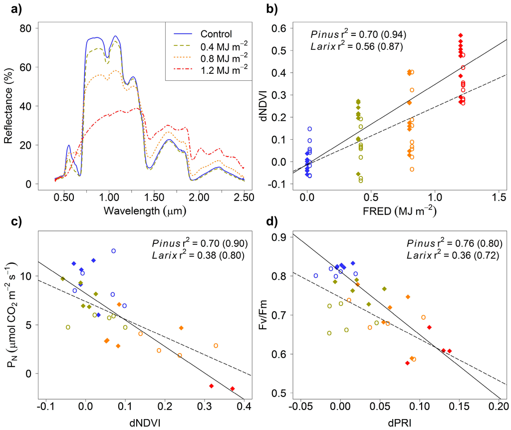 Spectral indices are strongly influenced by FRED dose and provide relatively accurate quantification of leaf physiological performance. Scatterplots display post-fire data with colors representing FRED doses: blue = control, yellow = 0.4 MJ·m−2, orange = 0.8 MJ·m−2, and red = 1.2 MJ·m−2, and solid markers representing Pinus and open markers representing Larix. The solid and dotted lines represent predicted values for Pinus and Larix, respectively. Regression fits of mean values are in parentheses. Sub-plots are as follows: (a) average spectral reflectance of Pinus FRED dose groups from ~0.4–2.5 µm; (b) dNDVI predicted from FRED four weeks post-fire (adapted from [8] to include a comparison with Larix); (c) PN predicted from dNDVI four weeks post-fire (adapted from [8] to include a comparison with Larix); and (d) chlorophyll fluorescence predicted from dPRI one week post-fire.