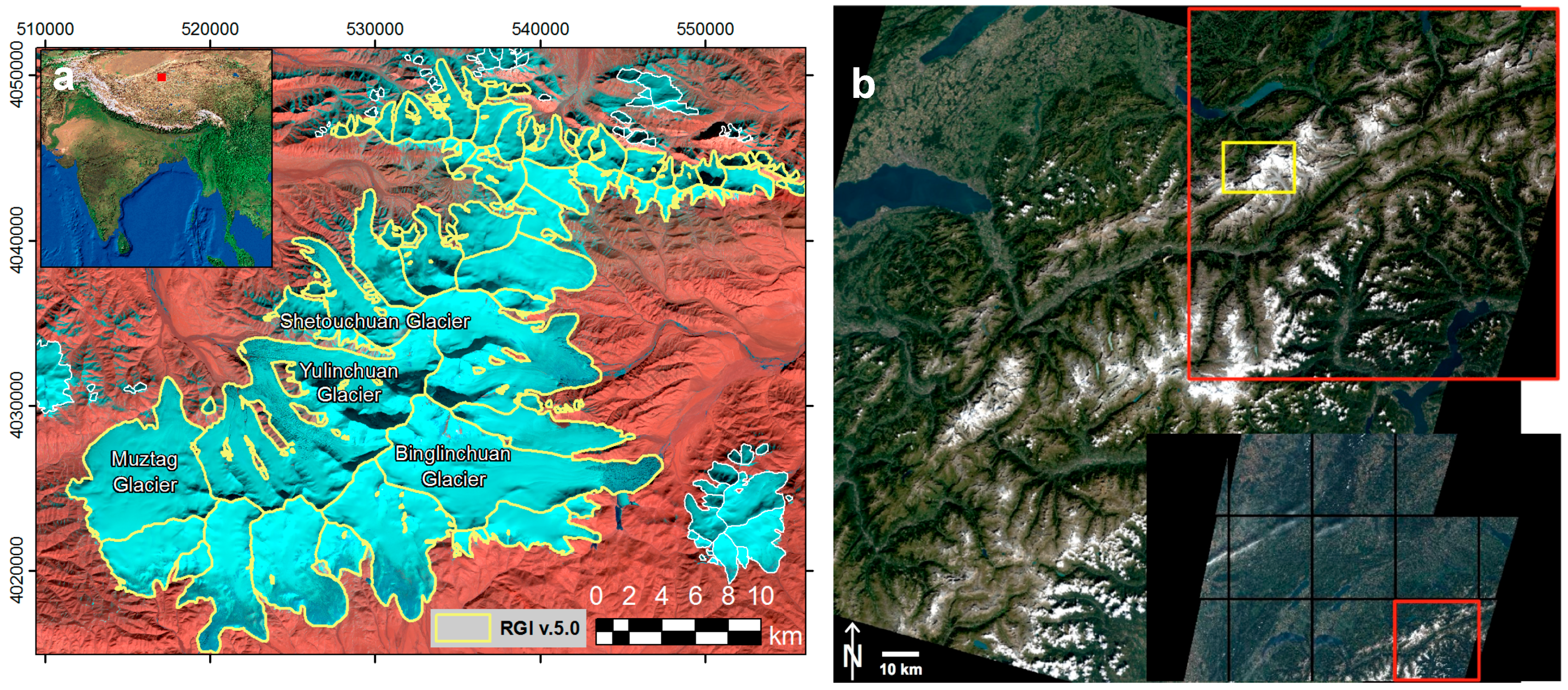 (a) Test region 1 in the Kunlun Mountains in northern Tibet using a S2A image from 18 November 2015 (FCC with bands 11, 8 and 4 as RGB). Glaciers are divided into entities based on the RGI (yellow); the four largest glaciers are named; (b) Landsat 8 OLI image of test region 2 in the western Swiss Alps acquired on 31 August 2015 (in natural colors). The lower inset shows the full swath and the individual tiles (width: 100 km) of the corresponding MSI scene acquired on 29 August 2015, with the red square marking the tile that is shown in the upper inset on top of the Landsat 8 image. The yellow square in this inset denotes the location of the test regions shown in Figures 2, 5 and 6.
