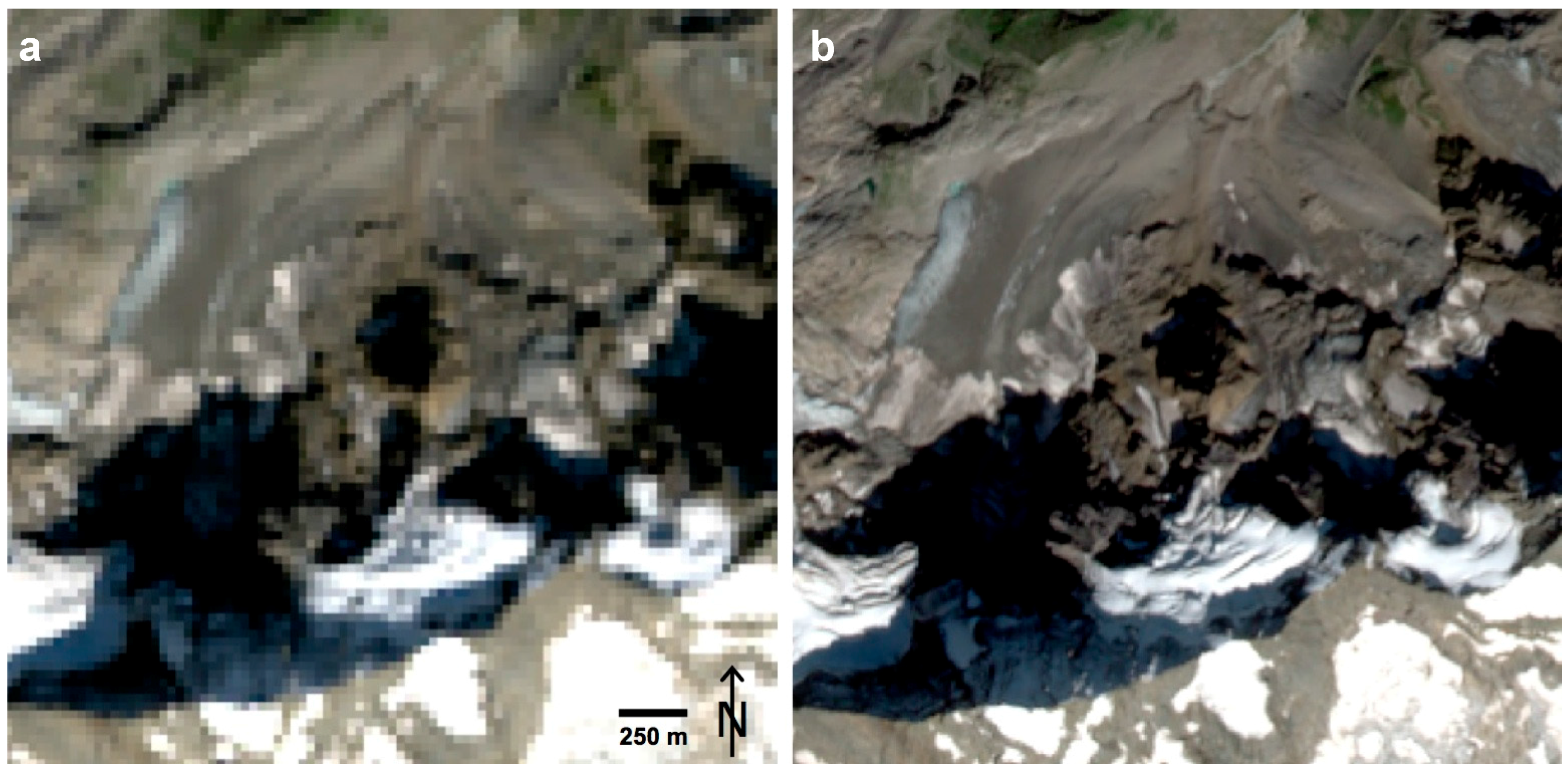 Direct comparison of the spatial resolution of 30 m OLI bands (a); and 10 m MSI bands (b). The larger debris-covered glacier to the left is Breithornglacier; image width is 2.8 km.