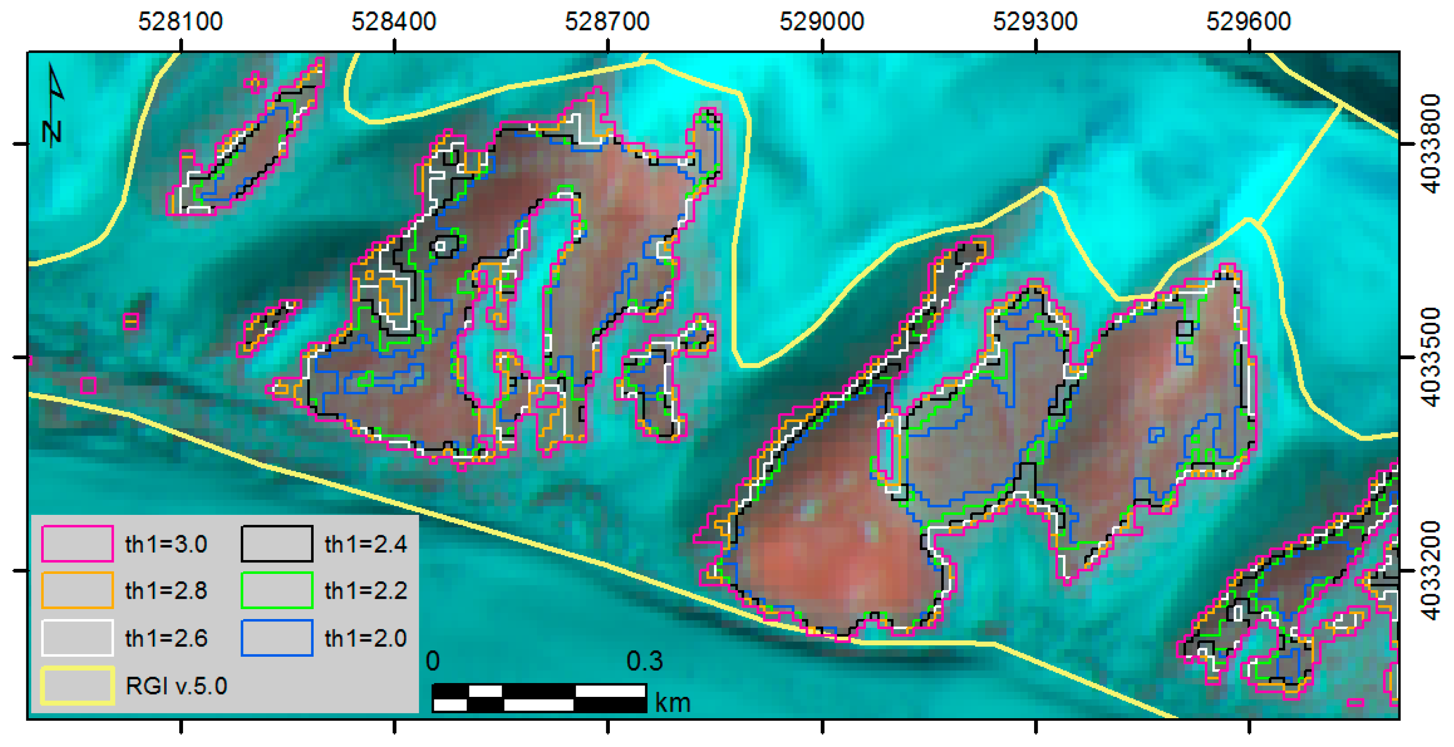 A direct comparison of the outlines derived from OLI red, OLI pan and MSI (Figure 6) shows that the latter two are generally contained in the first, as the larger pixel size (30 m) and the inclusion of mixed pixels result in larger glacier extents (for clean ice). However, overall the same regions and spots are mapped. Considering a small (non-systematic) shift between the MSI and OLI images (see Part I for details [18]), outlines from OLI pan (15 m) and MSI (10 m) are more or less coincident (Figure 6) and glacier extents are similar except in regions of topographic shadow.