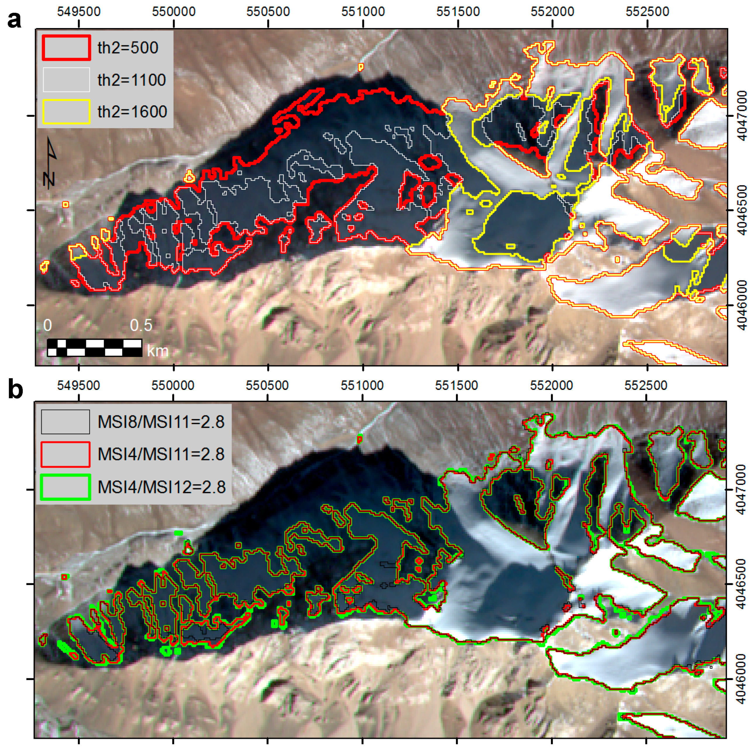 (a) Three different threshold values th2 applied to MSI2 do not change glacier extent in sunlight, but result in strong variations in cast shadow; and (b) three different band ratios (all using th2 = 1100) show minor variations in sunlight and shadow. Coordinate grid: UTM zone 45N.