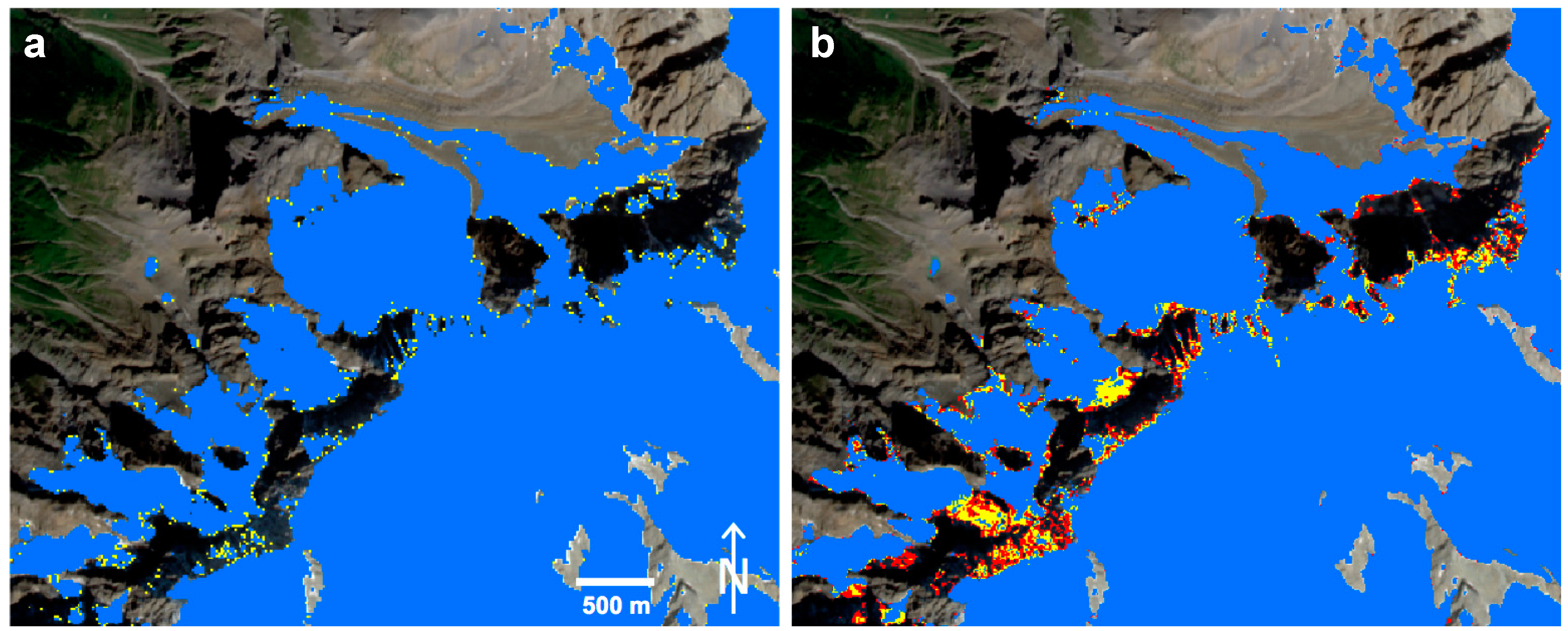 Threshold sensitivity of OLI (a) and MSI (b). (a) A threshold change from 1.4 to 1.38 removes the yellow pixels; (b) A threshold of 2.7 is used for th1 and 95 for th2 (all colors). Changing them to 2.8 and 105 removes the red pixels, changing th2 to 115 also removes the yellow pixels, i.e., much of the ice in shadow would be missed. Image width is 4.9 km.