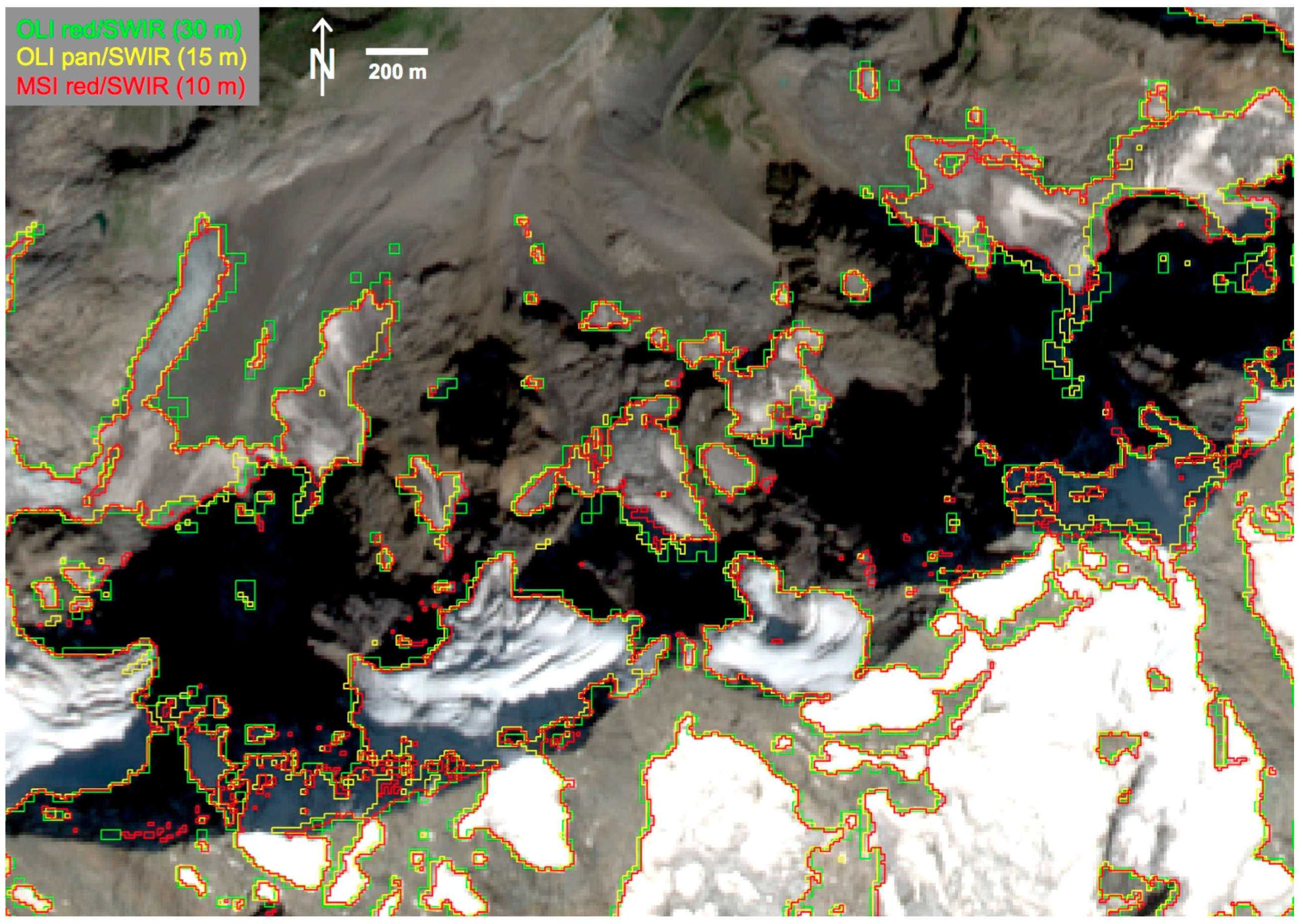 Owing to the changed spectral range of the 15 m panchromatic band of the OLI sensor (now covering only green and red), a ratio image OLI pan/SWIR can also be used, allowing the mapping of glaciers at 15 m spatial resolution. We notice only small differences in glacier extents from OLI pan/SWIR compared to MSI red/SWIR (<1%), but about 5% larger extents with OLI red/SWIR using 30 m bands. The latter is related to the inclusion of mixed pixels, in particular along the glacier perimeter. The effort required for manual correction of excluded dirty ice along the glacier boundary will thus be larger for outlines derived from MSI and 15 m OLI pan/SWIR. However, the higher spatial resolution allows a more precise digitizing, resulting in a higher quality product. Although we have not explicitly tested it here, we argue that the higher workload for glacier mapping is worth the effort. We used S2A data from the ramp-up and commissioning phase to obtain the above results. Details might change once datasets with the final calibration are released.