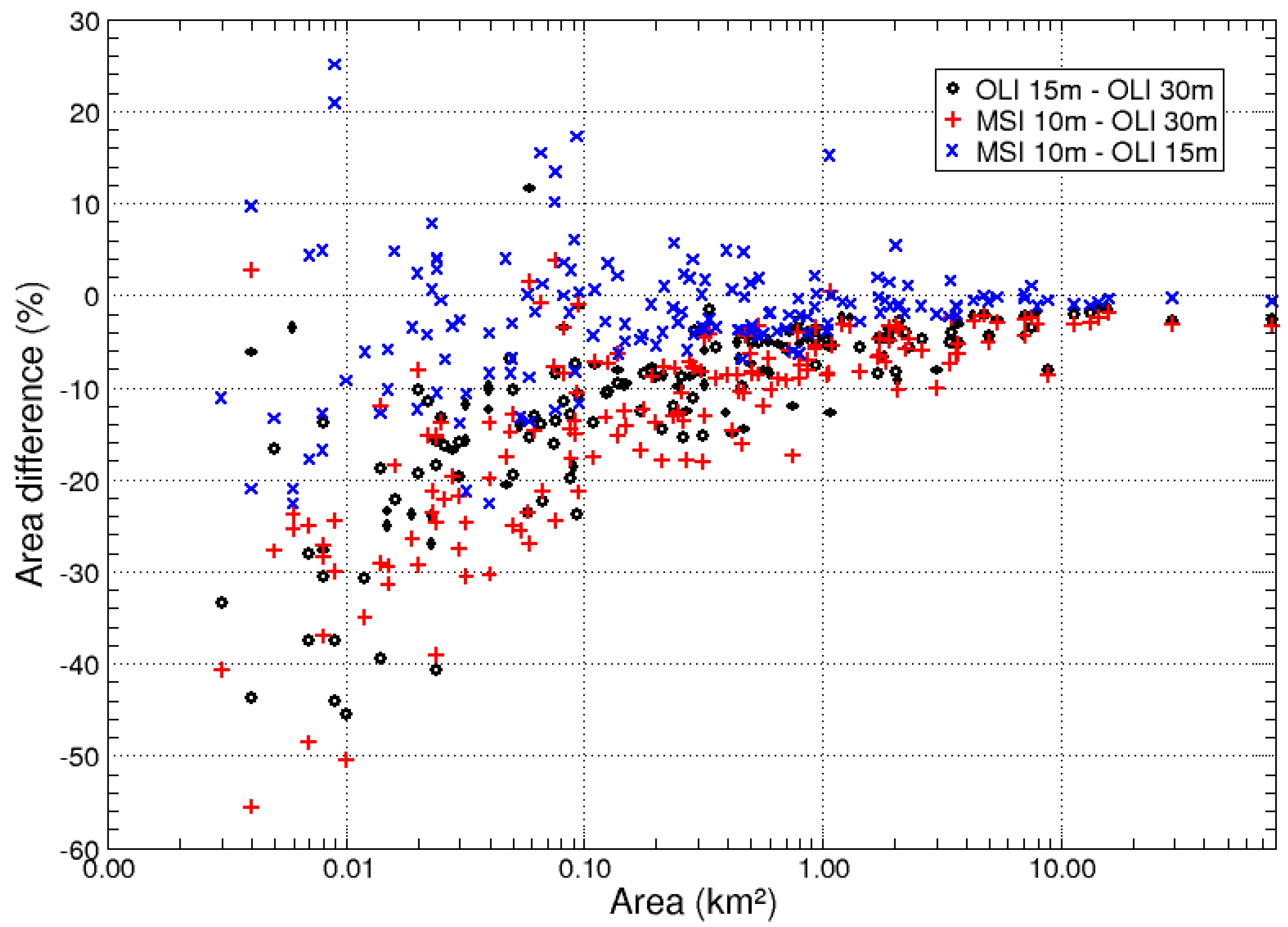 Relative area differences vs. glacier area for 155 selected glaciers and the three ratios shown in Figure 8: OLI 15 m = OLI8/OLI6, OLI 30 m = OLI4/OLI6, and MSI 10 m = MSI4/MSI11.
