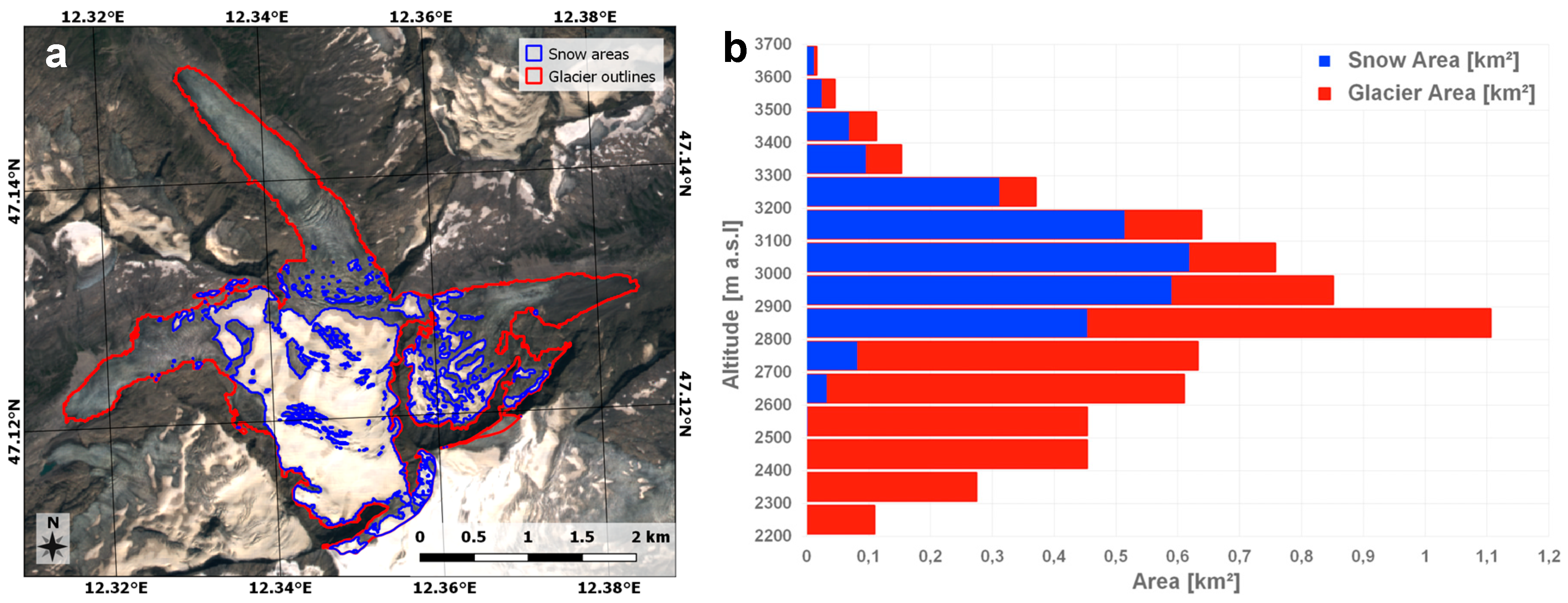 (a) True-color composite of the Sentinel-2A scene from 13 August 2015 showing a subset of the Hohe Tauern range region (the peak of the Großvenediger is in the lower center) with glacier outlines (red) and the classified snow-covered regions (blue). Image width is about 6 km; (b) Area-elevation distribution of the snow and glacier cover for the region shown in (a).