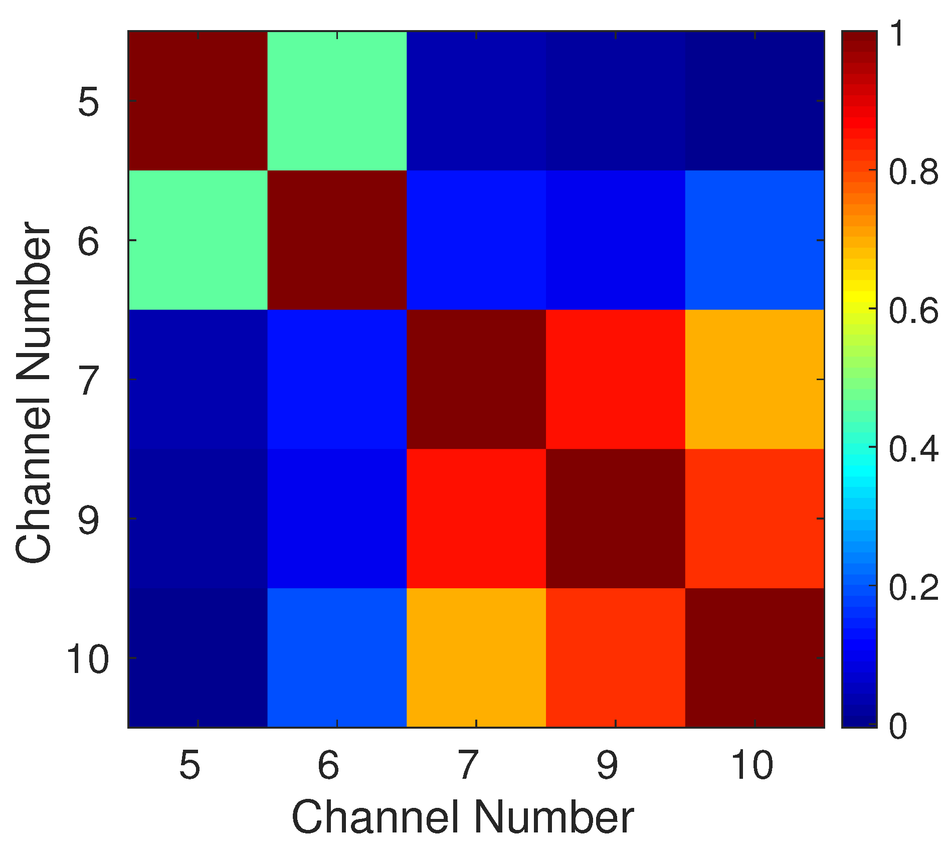 Estimated observation error correlation matrix for assimilated SEVIRI channels. We remark that more than 150,000 samples were used to calculate each entry of the inter-channel covariance matrix.