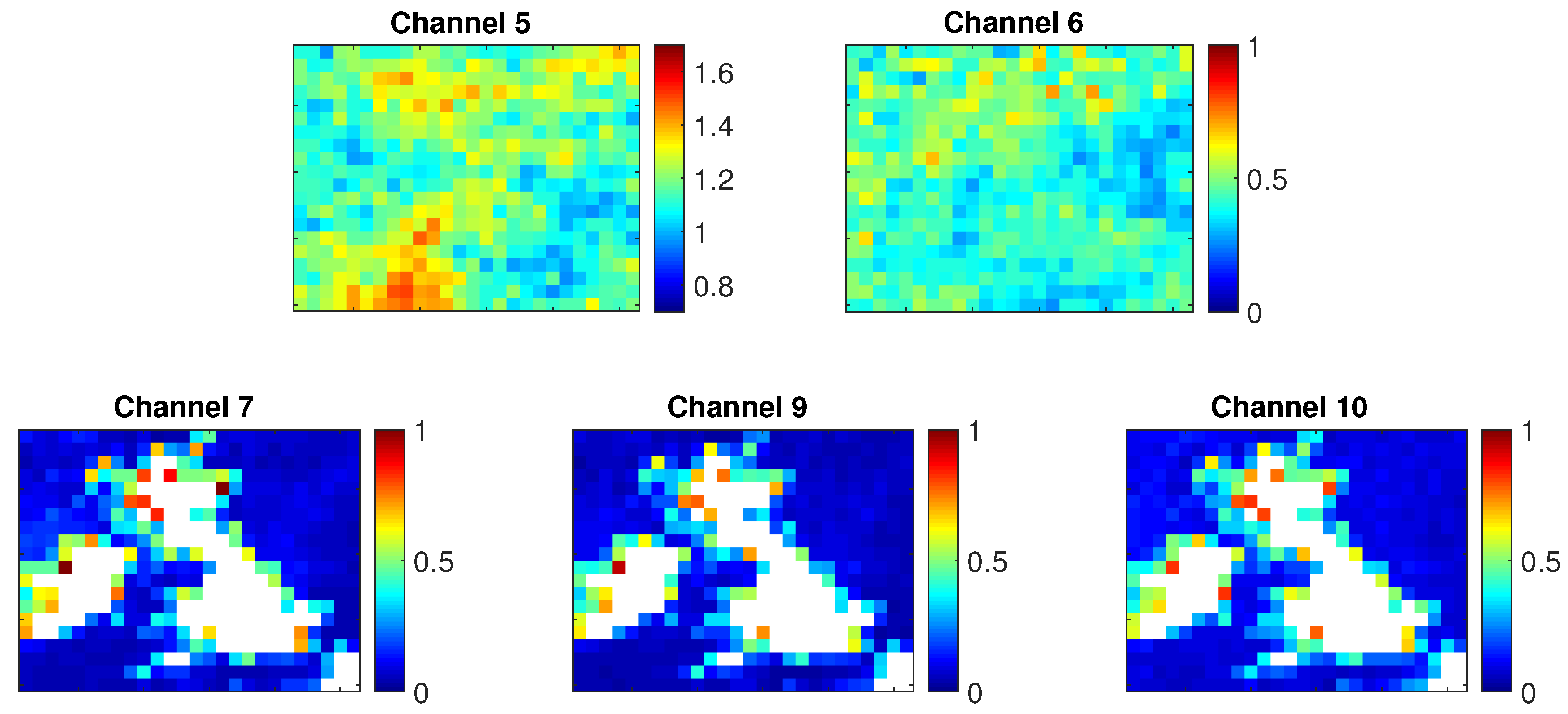 Observation error variance estimated over sub-domains of the UKV for channels 5, 6, 7, 9 and 10. For each sub-plot, each pixel represents the variance calculated over that sub-domain of the full UKV domain. White pixels are areas where there was no data available for calculating the observation error variance. Note that the colour scale is different for Channel 5.