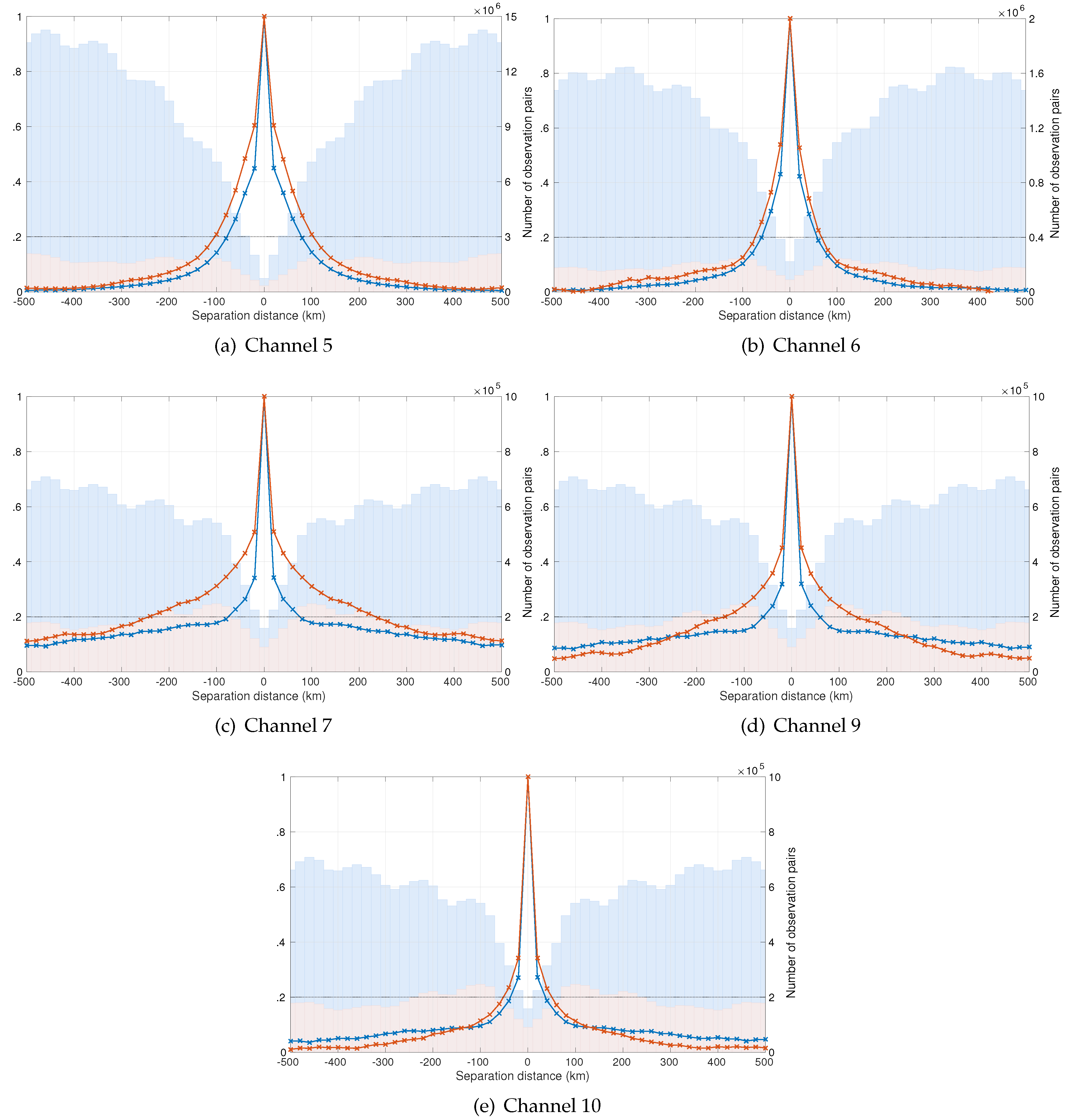 We next consider the horizontal observation error variances and correlations. We give the variances in Table 2 and see that these are equal to the full domain inter-channel variances; this is expected since the same data set is used to calculate the variance. We plot the horizontal correlations, along with the number of observation pairs used to calculate them, for each channel in Figure 5 (blue lines/bars). We see that the correlation structures for the upper level water vapour channels are similar (Figure 5a,b) with the correlation reducing smoothly and reaching zero by 500 km separation distance. However, the observations from Channel 5 have errors correlated with a longer length scale, 80 km, than observations from Channel 6 that have a correlation length scale of 65 km. It is possible that the larger correlation length scale for Channel 5 is caused by the assimilation of cloudy radiances from this channel. The surface channels (Figure 5c–e) also share a similar correlation structure with an initial sharp decrease in correlation before the correlation decays slowly, with some correlation, though not necessarily significant, still existing at the 500 km separation distance. Channel 7 has the longest correlation length scale of 75 km. Channel 9 has shorter length scales of approximately 50 km, and Channel 10 has even shorter length scales (approximately 35 km). The cause of the correlated error is likely to be a combination of errors introduced in the RTTOV model and representativity errors. The representativity errors are likely to contribute to the different correlation structures found in the upper level water vapour (humidity) channels and the surface (temperature) channels. This is supported by the work of [2], which showed that representativity errors are more significant for humidity than temperature.