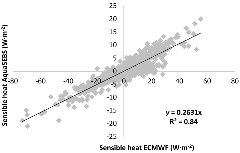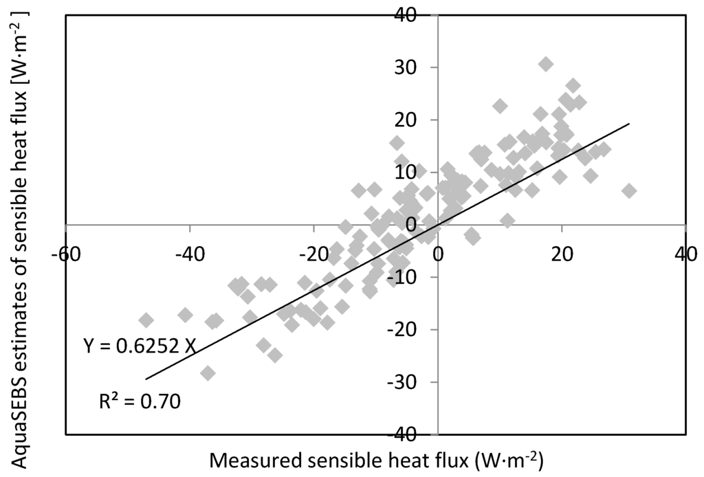 Although [10] stated that the poorest estimation of sensible heat flux takes place when the difference between the roughness lengths is small, AquaSEBS produces good estimations of the sensible heat. This is due to the iteration process of the similarity relationship between the sensible heat, friction velocity and Monin-Obukhov length, which improves the accuracy of the estimates. In addition, AquaSEBS shows lower sensitivity to the roughness parameters over water surfaces than to the atmospheric parameters (see Section 4.6).